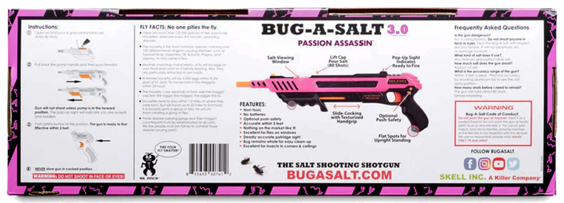 BUG-A-SALT 3.0 Pink Passion Assassin je posodobljena različica priljubljene “solne puške” za odrasle, ki odstranjuje insekte s kratkim strelom kuhinjske soli. Zahvaljujoč mehanskemu pogonu brez baterij je vedno pripravljena na akcijo in ob pravilni uporabi ne poškoduje površin, kot so okna ali zasloni. Rožnato‑črna zasnova z oranžnimi poudarki doda vašemu “lovu na muhe” stil.