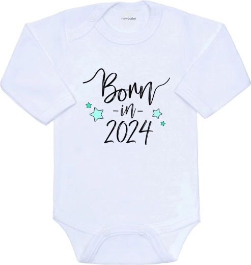 Slogovno in udobno otroško bodi z dolgimi rokavi ter napisom Born in 2024 iz prijetnega 100 % bombaža. Certificirane barve potiska so varne za dojenčke. Praktično zapiranje s pritiskači na ramenu in med nogicama olajša oblačenje in previjanje.
