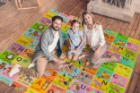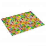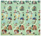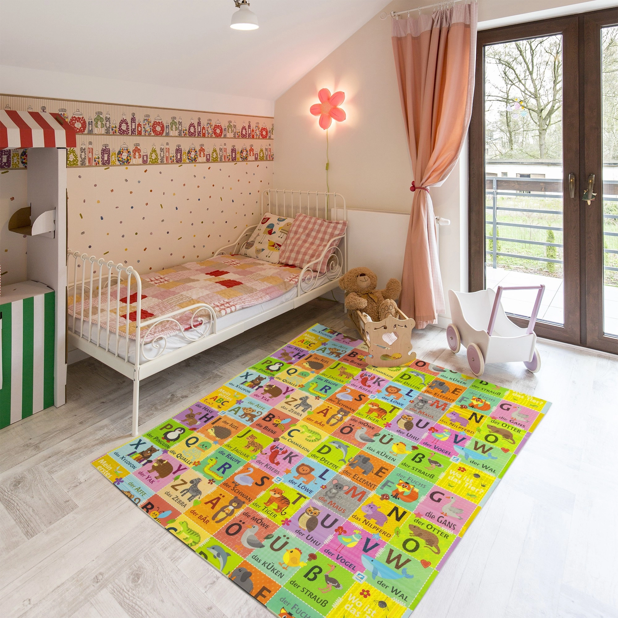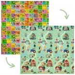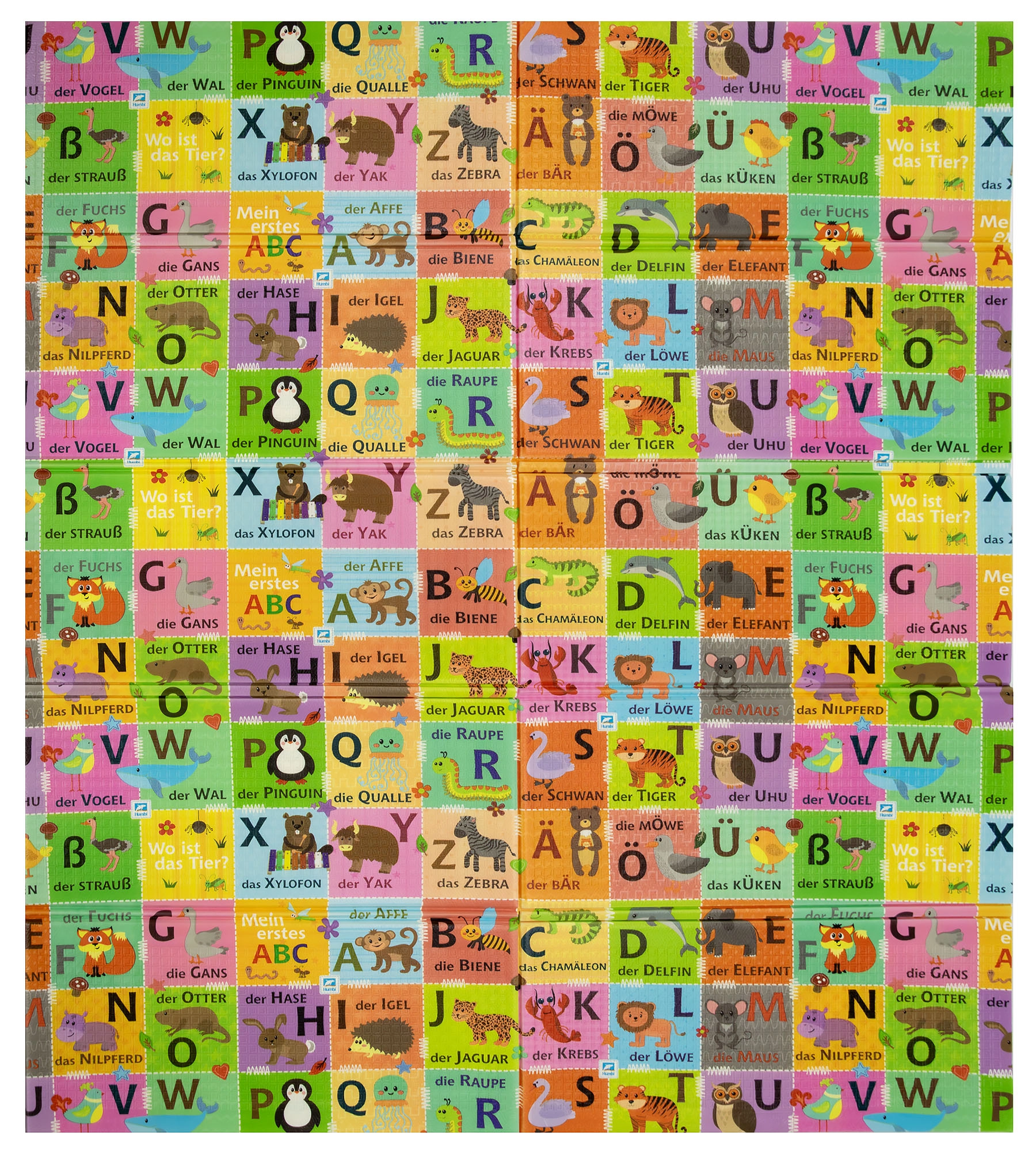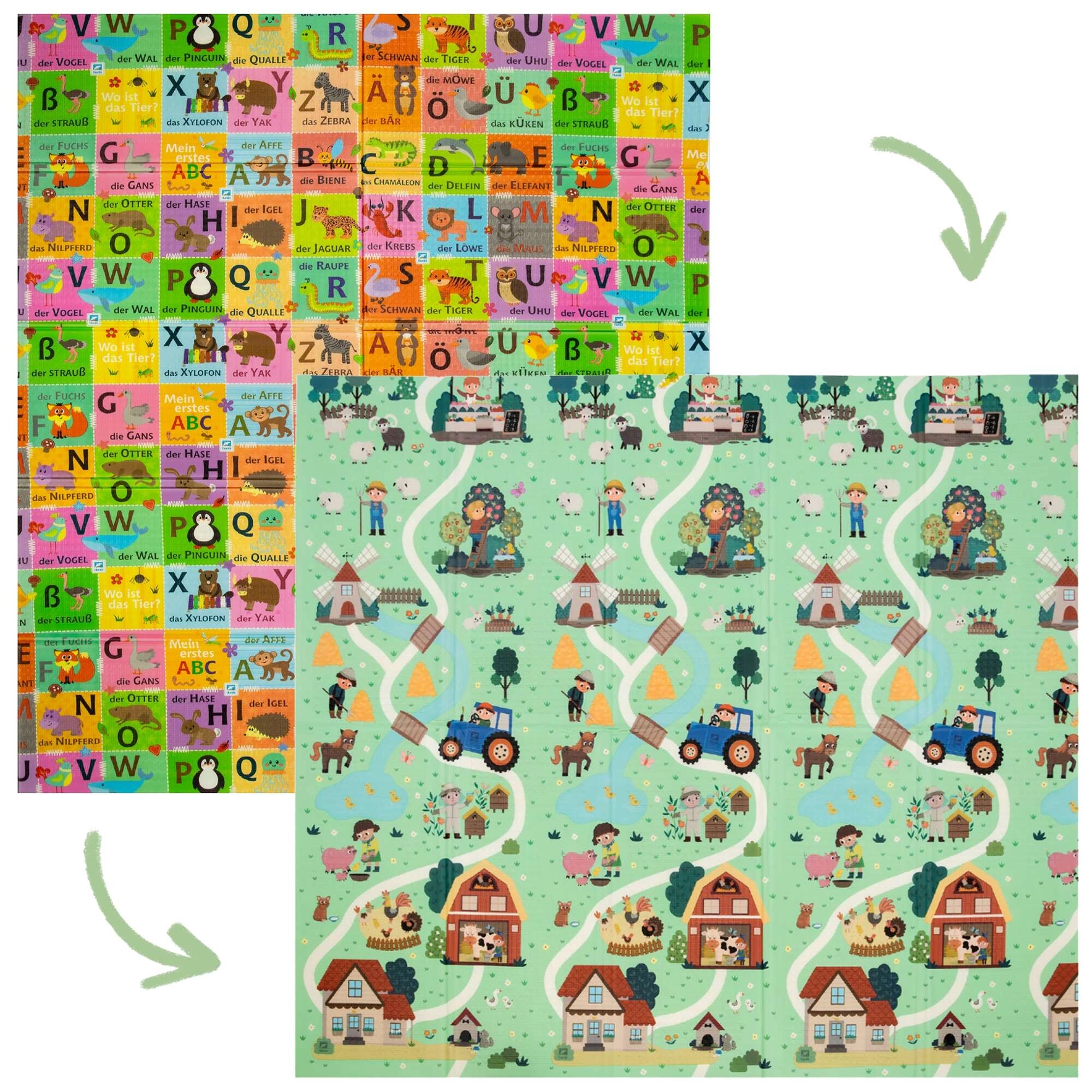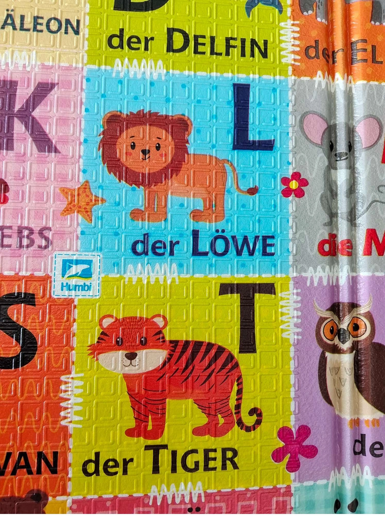 Dve strani z izobraževalno grafiko podpirata zgodnje učenje: ena prikazuje nemško abecedo z živalmi, druga sceno iz življenja na podeželju. Zahvaljujoč nedrseči nežno reliefni površini je varna za plazenje in hojo ter hkrati spodbuja senzorični razvoj.