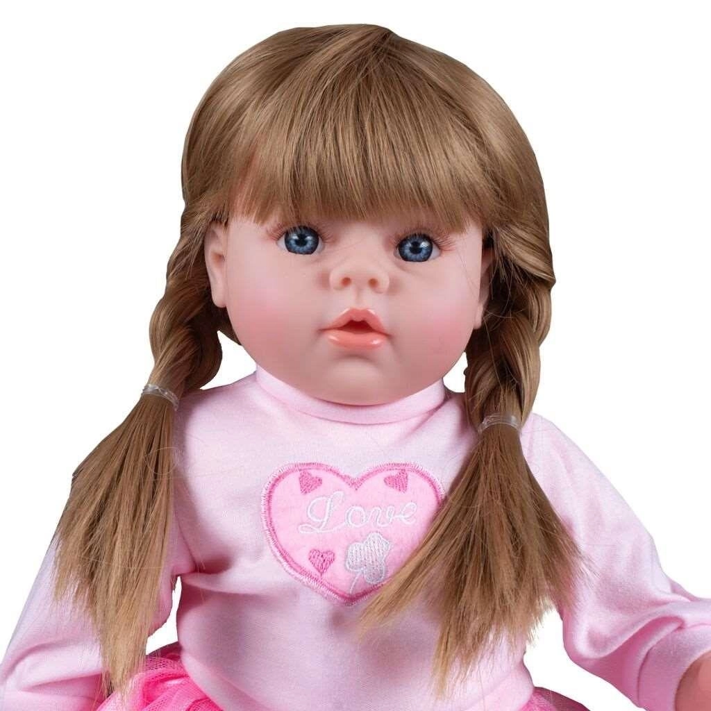 Punčka PlayTo Tina dolžine 46 cm je odličen spremljevalec za igre vlog mamice in očka. Realistične obrazne poteze, spleteni rjavi lasje in nežna oblačila v rožnatih tonih spodbujajo nežno igro in skrb. Zaradi mehkega telesca je punčka prijetna za crkljanje, medtem ko gumijasti udi in glava zagotavljajo vzdržljivost pri vsakodnevni uporabi.