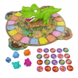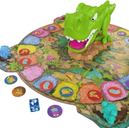 Vstopite v barvit prazgodovinski svet, kjer igralci mečejo kocko, premikajo svoje jamske figurice po igralnem načrtu in zbirajo tematske prigrizke – od taco‑daktila do prazgodovinske pice. V središču dogajanja je velik zeleni dinozaver, katerega interaktivni “jezik” zna pobirati žetone ali pošiljati nasprotnike nazaj.