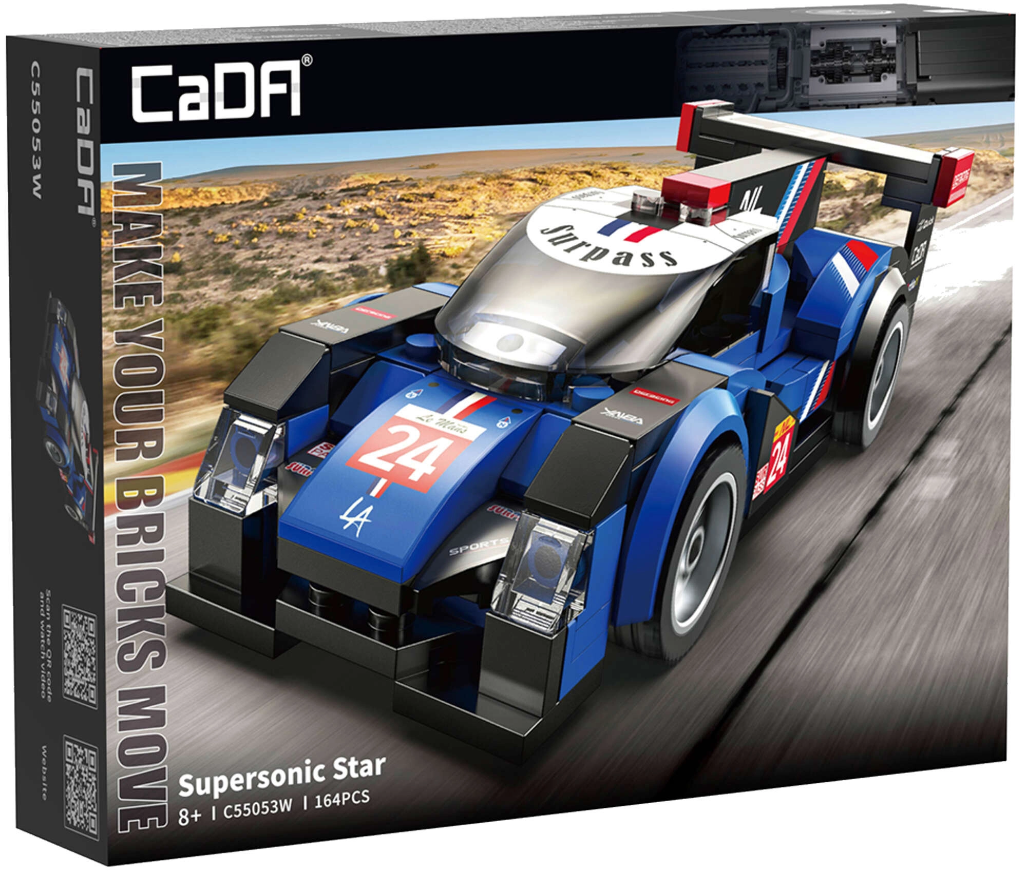 Gradbeni komplet CaDA Supersonic Star bo razveselil vse male in velike konstruktorje. Modra karoserija z belimi, rdečimi in črnimi elementi deluje realistično in poudarja športni videz. Zahvaljujoč preglednim navodilom model brez težav sestavijo tudi začetniki, korak za korakom.