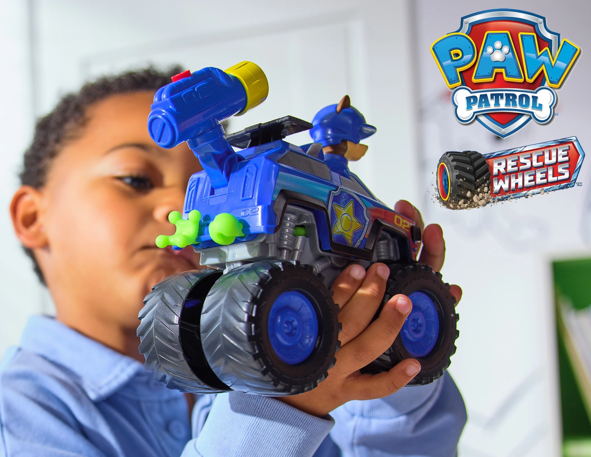 Terensko vozilo Chase je pripravljeno na vsako dogodivščino. Zahvaljujoč velikim, prosto vrtečim se kolesom obvlada tudi »off-road« vožnjo po otroški sobi, izstreljevalnik s kavljem pa poskrbi za napete reševalne akcije. Figurica Chase s čelado sedi kar za volanom in navdihuje zgodbe iz sveta PAW PATROL.