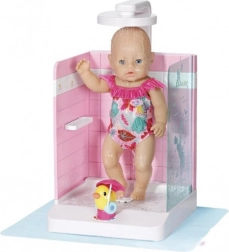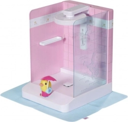 Praktično držalo za punčko varno drži dojenčka BABY born ali starejšega sorojenca na mestu, nastavljiva višina prhe pa se prilagodi obema velikostma. Priložena je tudi podloga proti škropljenju, ki ohranja okolico suho. Eleganten dizajn z rožnatimi ploščicami se odlično ujema z dodatki iz kolekcije Kopalnica.
