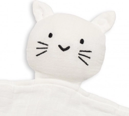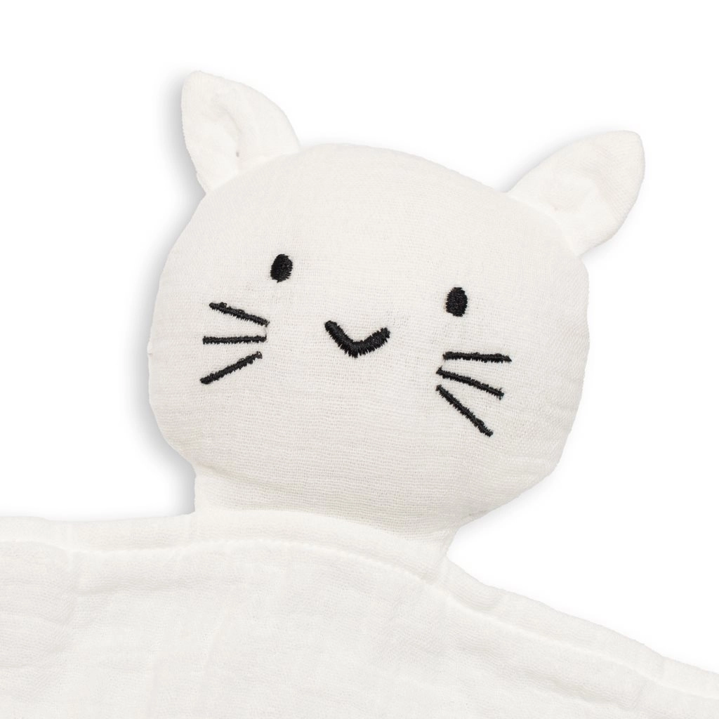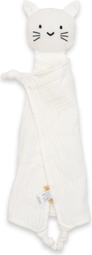 Mušelinska ninica NEW BABY Cat v beli barvi je lahka, zračna in prijetna na dotik. Idealna za crkljanje, pomiritev in kot spremljevalec na poti. Organski bombaž je nežen do občutljive otroške kože in pomaga dojenčku, da se počuti varno.