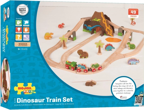 Odkrijte barvit prazgodovinski svet s to leseno dinozavrsko železniško progo znamke BIGJIGS RAIL. Set s 49 kosi ponuja dinozavrski vlak, vulkan s tunelom in pisane figurice dinozavrov. Združljivost z drugimi lesenimi tiri, kakovostni materiali in varna izvedba spodbujajo domišljijo, fino motoriko in koordinacijo otrok od 3 let naprej.