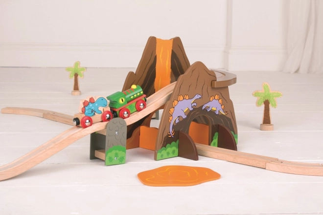 Doživite pustolovščino v prazgodovini z železniško progo, kjer se srečata železnica in dinozavri. Otroci zgradijo krog okoli vulkana s tunelom, se zapeljejo z dinozavrskim vlakom in ustvarjajo lastne zgodbe s pisano obarvanimi figuricami. Leseni deli so robustni, prijetni na otip in idealni za vsakodnevno igro.