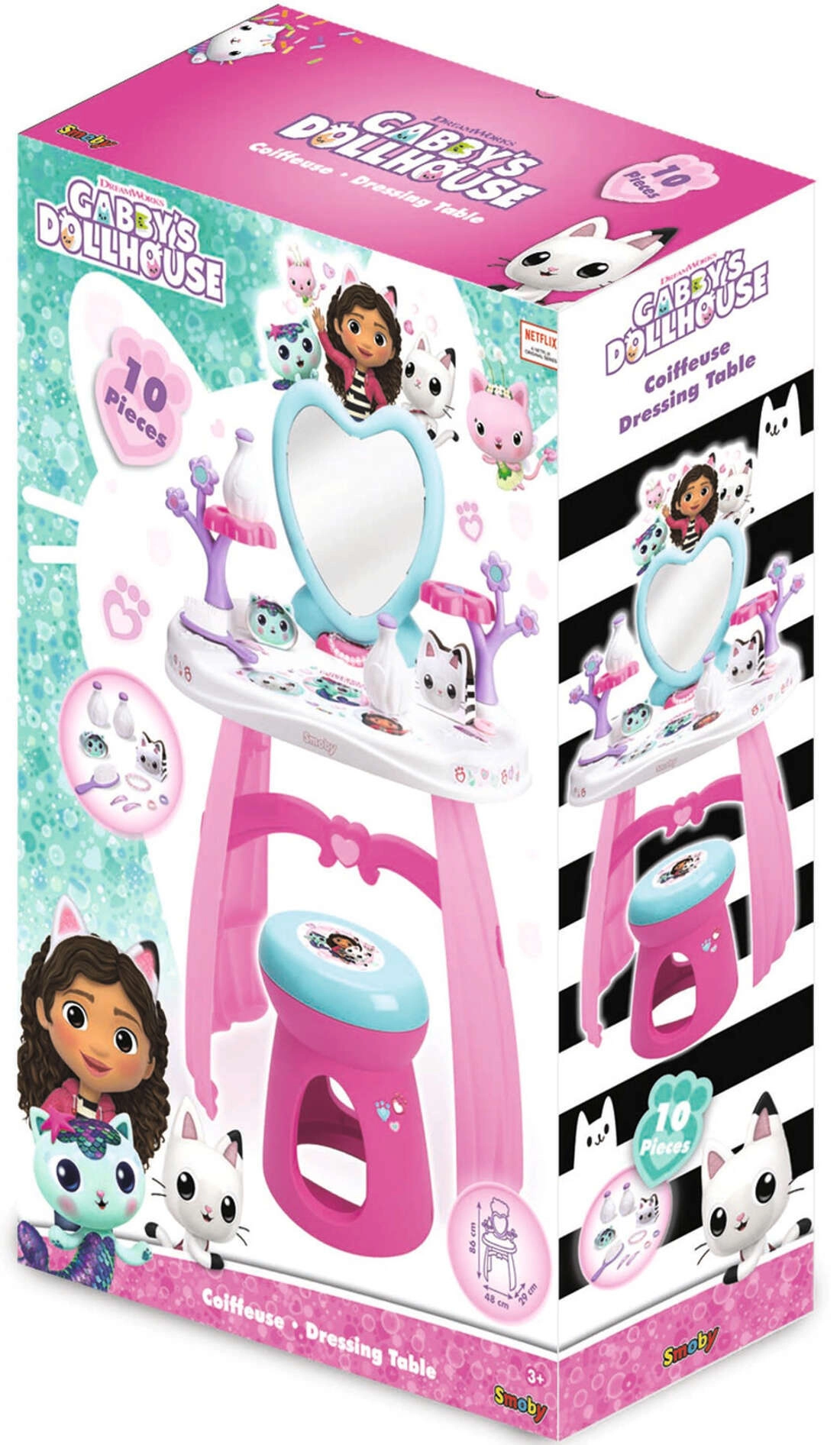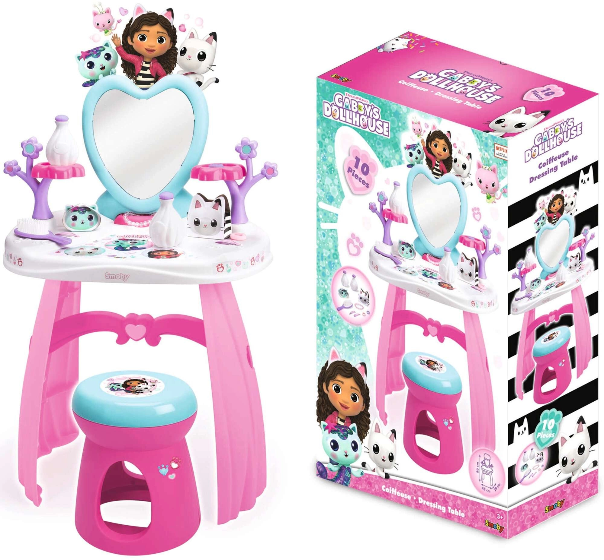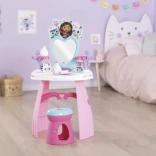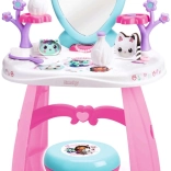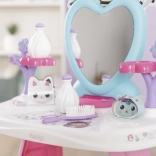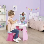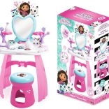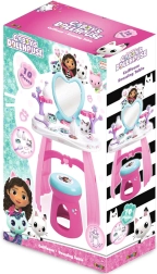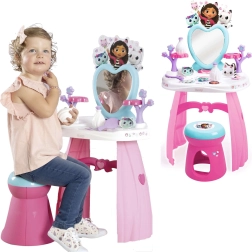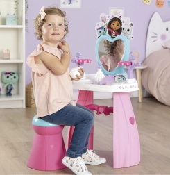 Ustvarite si doma lasten lepotni salon s toaletno mizico, navdihnjeno s serijo GABBY’S DOLLHOUSE. Pastelne rožnato‑vijolične barve, srčkasto ogledalo in prisrčne mačje dekoracije spodbujajo domišljijo in podpirajo kreativno igro vlog. Lahka, a stabilna konstrukcija in zaobljeni robovi so idealni za otroke od 3 let.