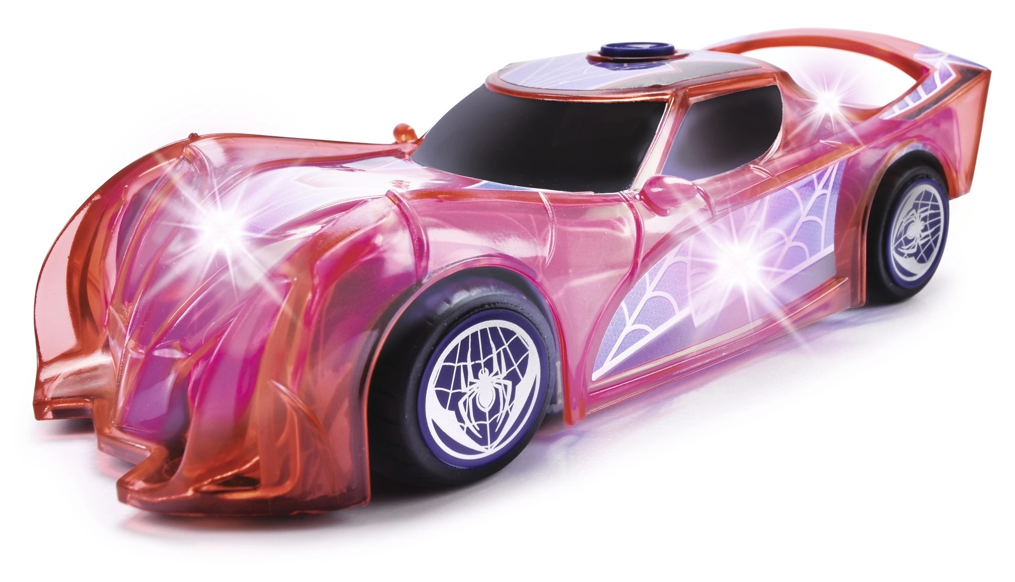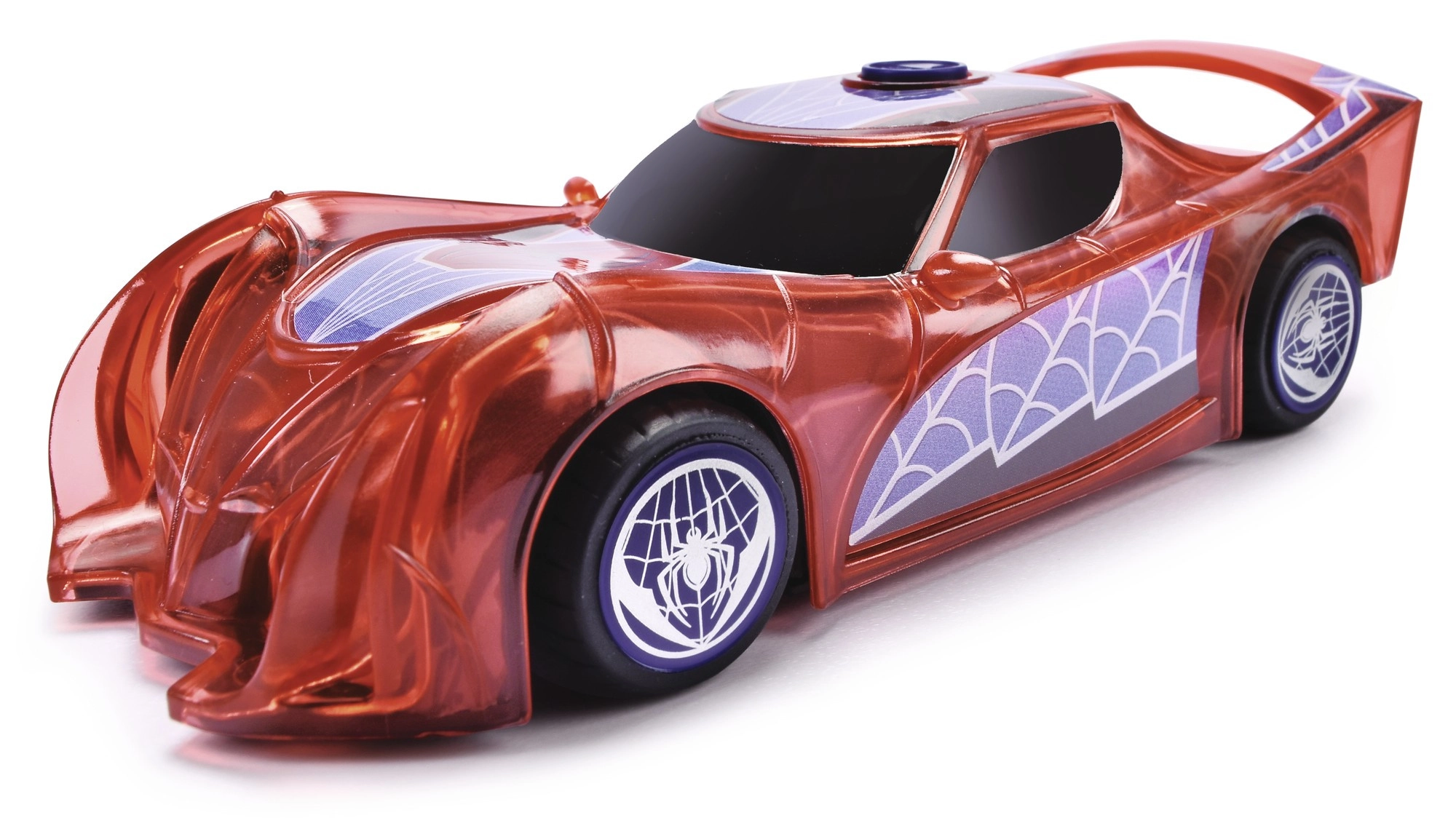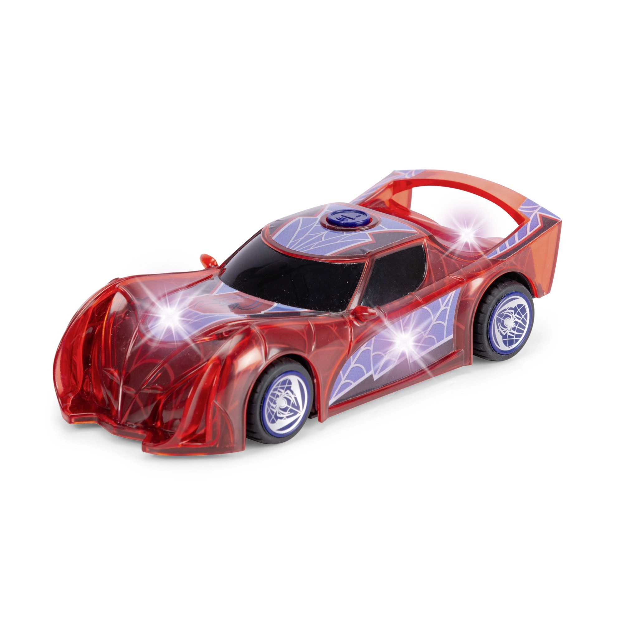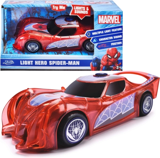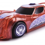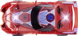 Superjunaški avto SPIDER‑MAN v značilni rdeči barvi s pajčevinastimi detajli izstopa s prosojnim dizajnom in vgrajenimi LED lučmi, ki osvetlijo vsako pustolovščino. Preprost push‑and‑go mehanizem (frikcijski pogon) zahteva le rahel potisk in avto se požene naprej.