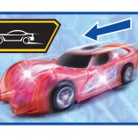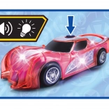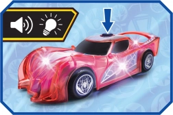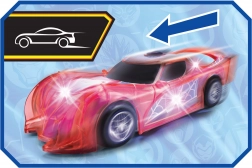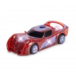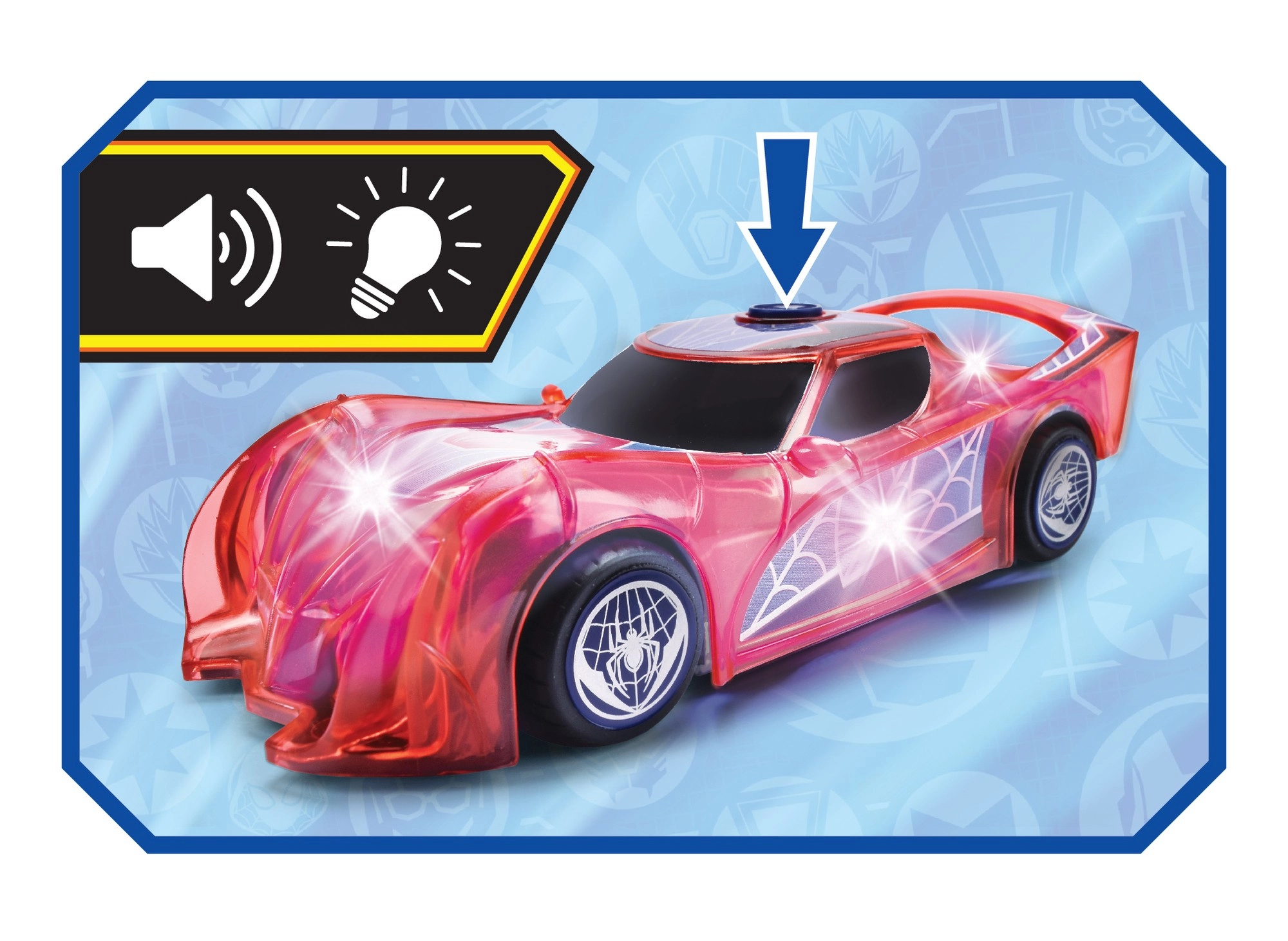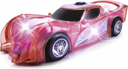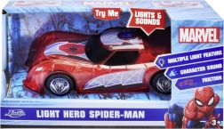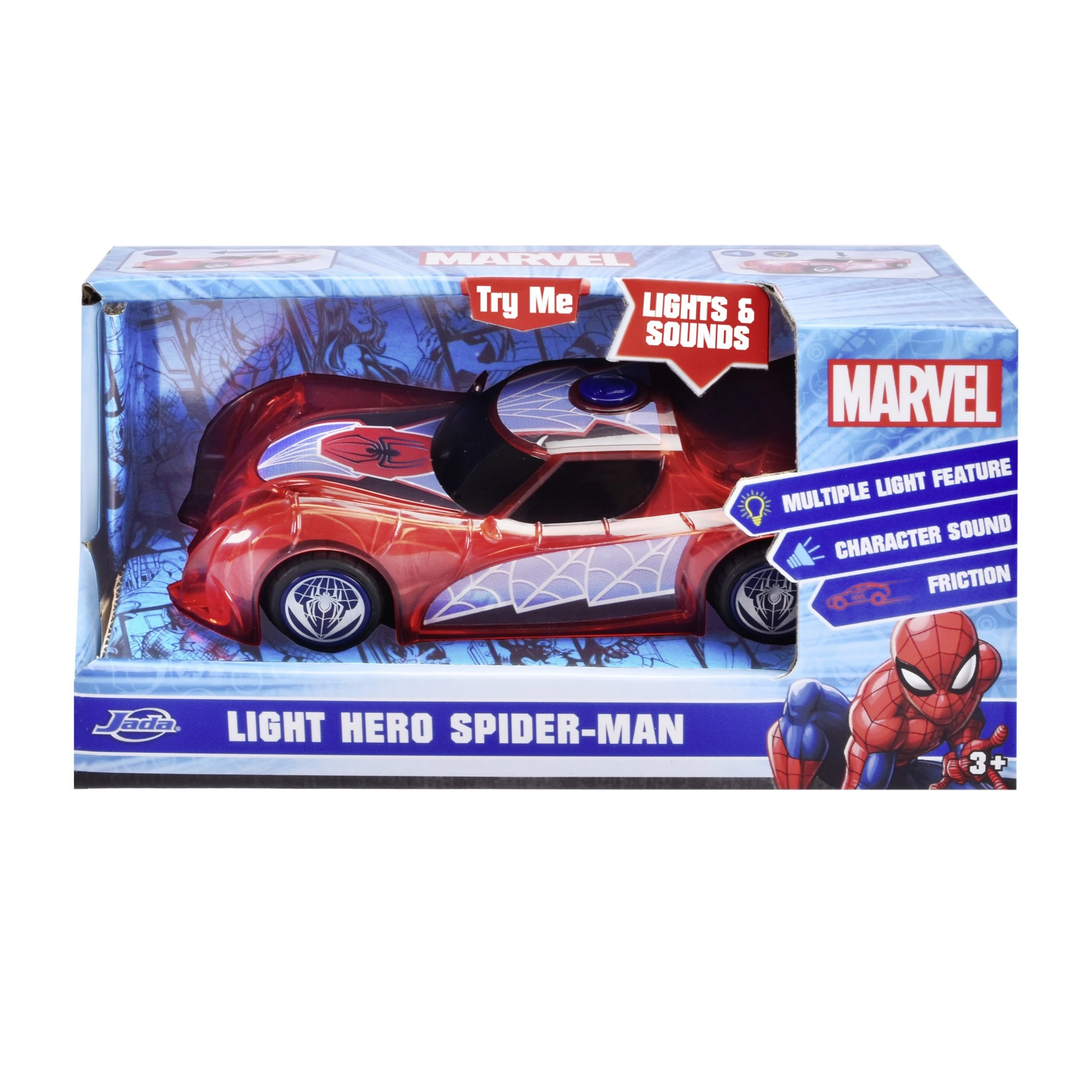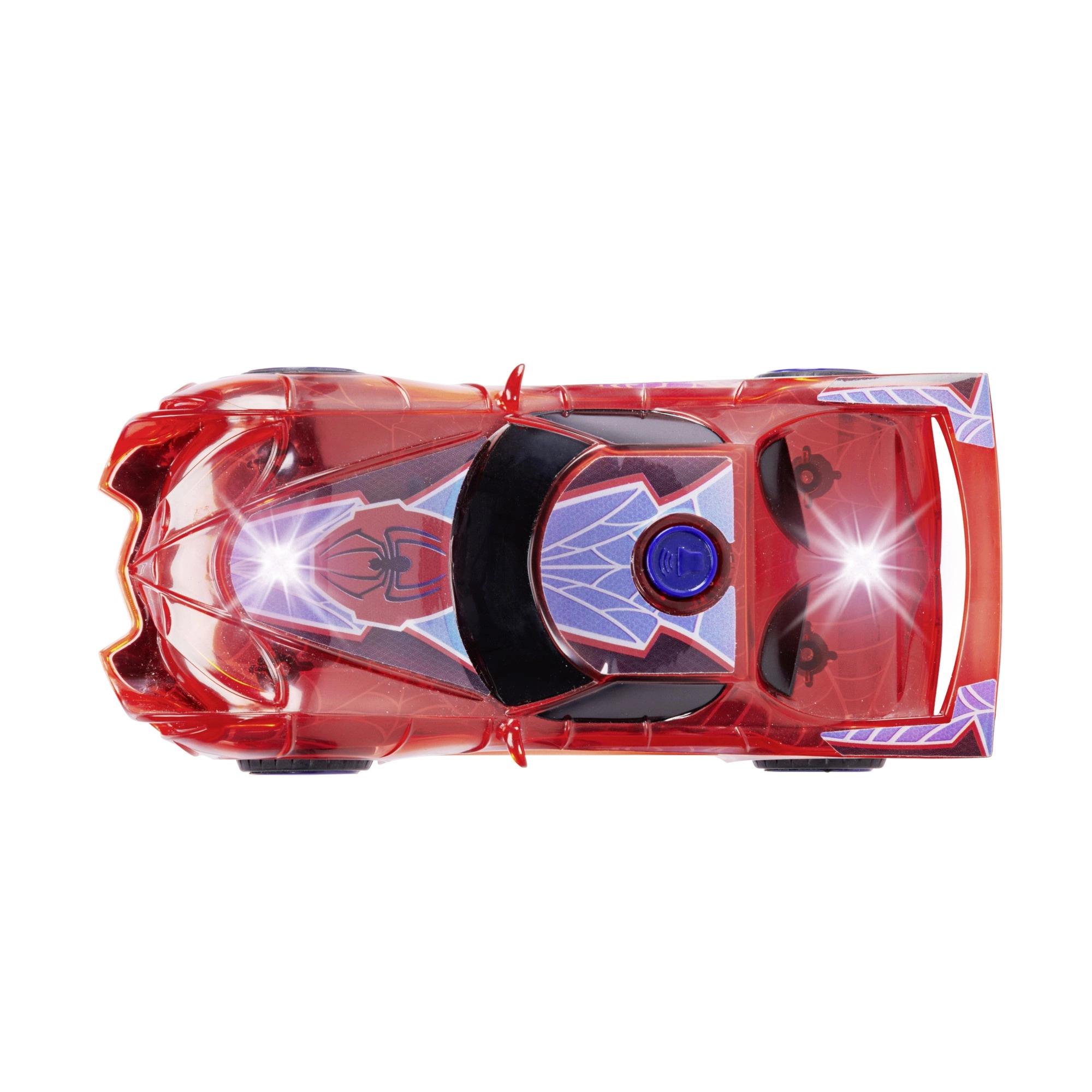 Superjunaški avto SPIDER‑MAN v značilni rdeči barvi s pajčevinastimi detajli izstopa s prosojnim dizajnom in vgrajenimi LED lučmi, ki osvetlijo vsako pustolovščino. Preprost push‑and‑go mehanizem (frikcijski pogon) zahteva le rahel potisk in avto se požene naprej.