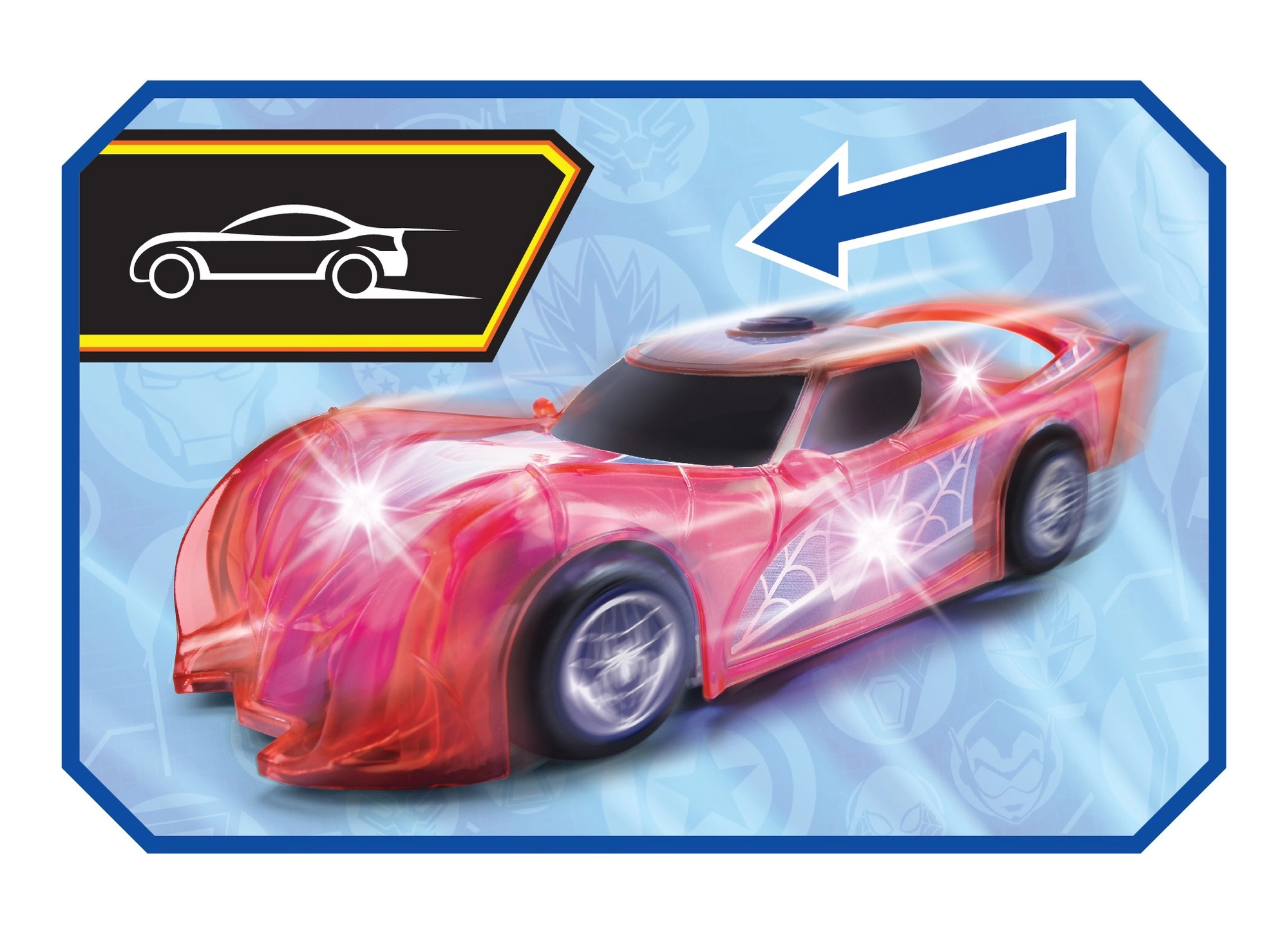 Zaradi zvočnih učinkov in robustnih koles je idealen za domače dirke in igro na ravnih površinah. Otroci bodo uživali v prizorih iz Avengers, divjih zasledovanjih in superjunaških misijah.