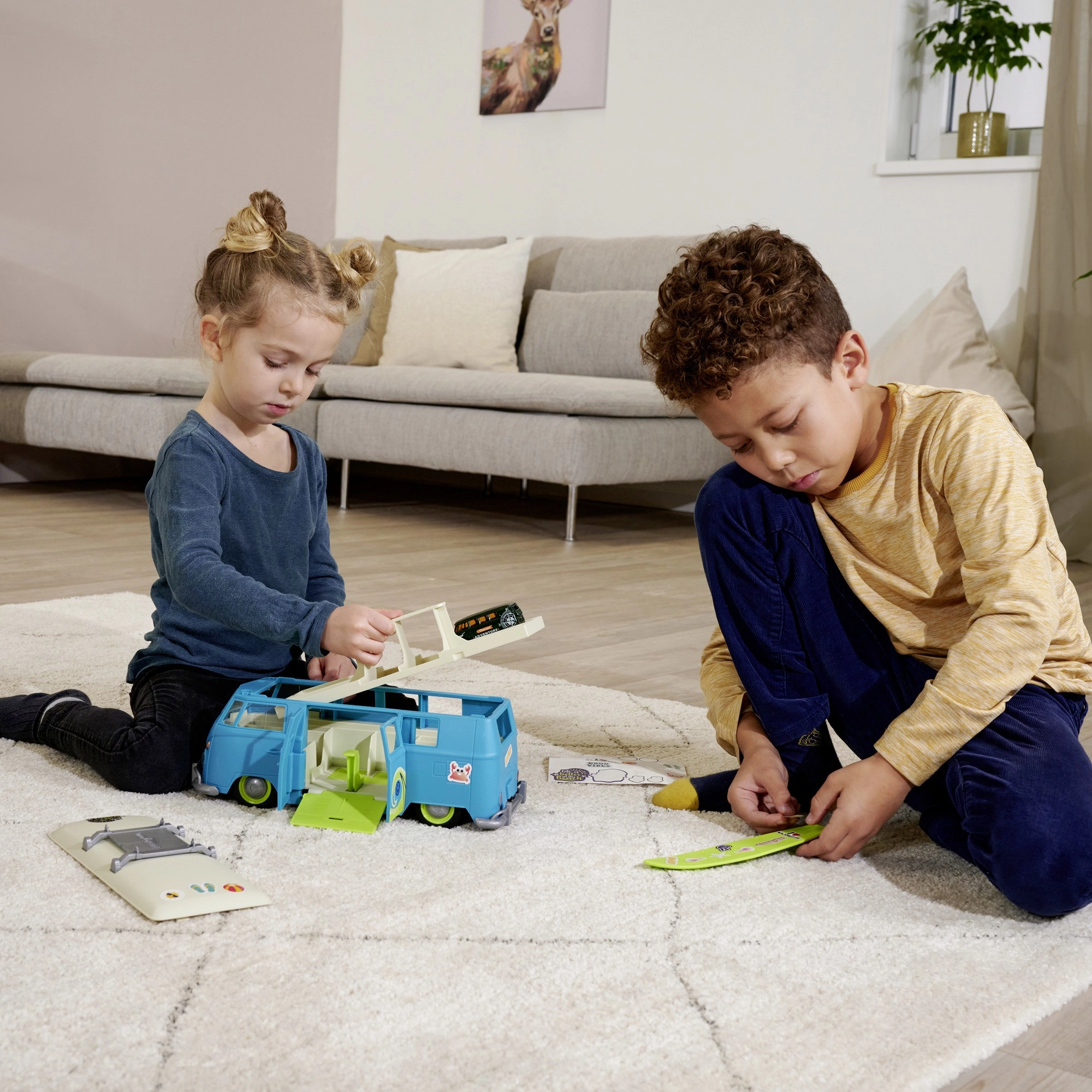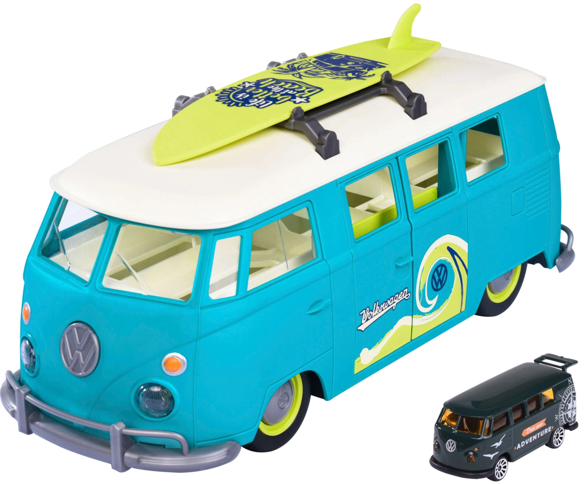 Velik interaktivni Volkswagen T1 znamke MAJORETTE navdušuje s precizno izdelavo in pristnimi detajli legendarnega kamperja. Nosilec v obliki dostavnika v modro-zeleni barvi s kremnimi poudarki se odpre v praktičen igralni kovček s parkirnimi mesti za priloženi avtomobilček. Sprednji gumb v obliki logotipa VW aktivira močne luči.