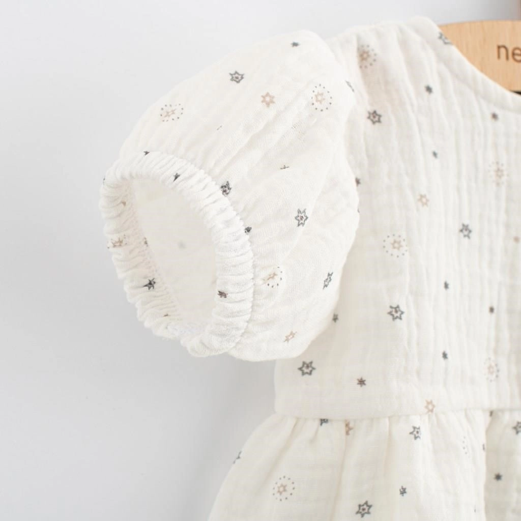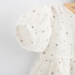 Muslinasta obleka New Baby Zora je idealna izbira za tople dni. Zaradi lahke in zračne strukture muslina tkanina odlično diha in pomaga preprečevati pregrevanje. Mehkoba in nežnost materiala zagotavljata maksimalno udobje skozi ves dan.