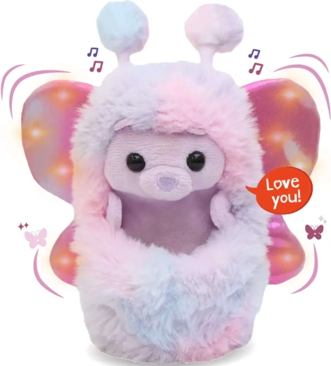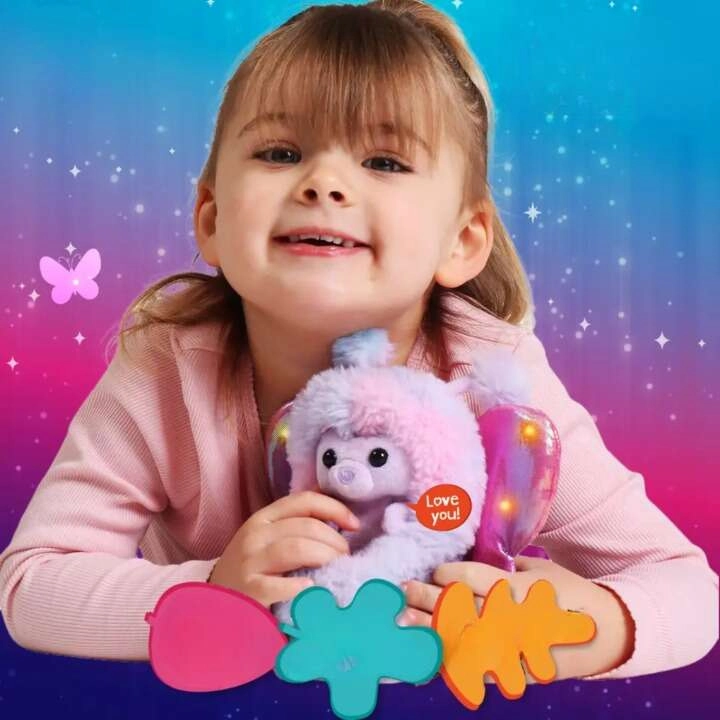 Bella je interaktivni plišasti medvedek, ki reagira na dotike – dovolj je, da ji nežno stisnete trebušček, jo pobožate ali se dotaknete noska, in začne oddajati več kot 45 zvokov: smeje se, pošilja poljubčke in prisrčno reče “I love you” (v angleščini). Zaradi višine 18 cm odlično sede v roko in je idealna za crkljanje pred spanjem.
