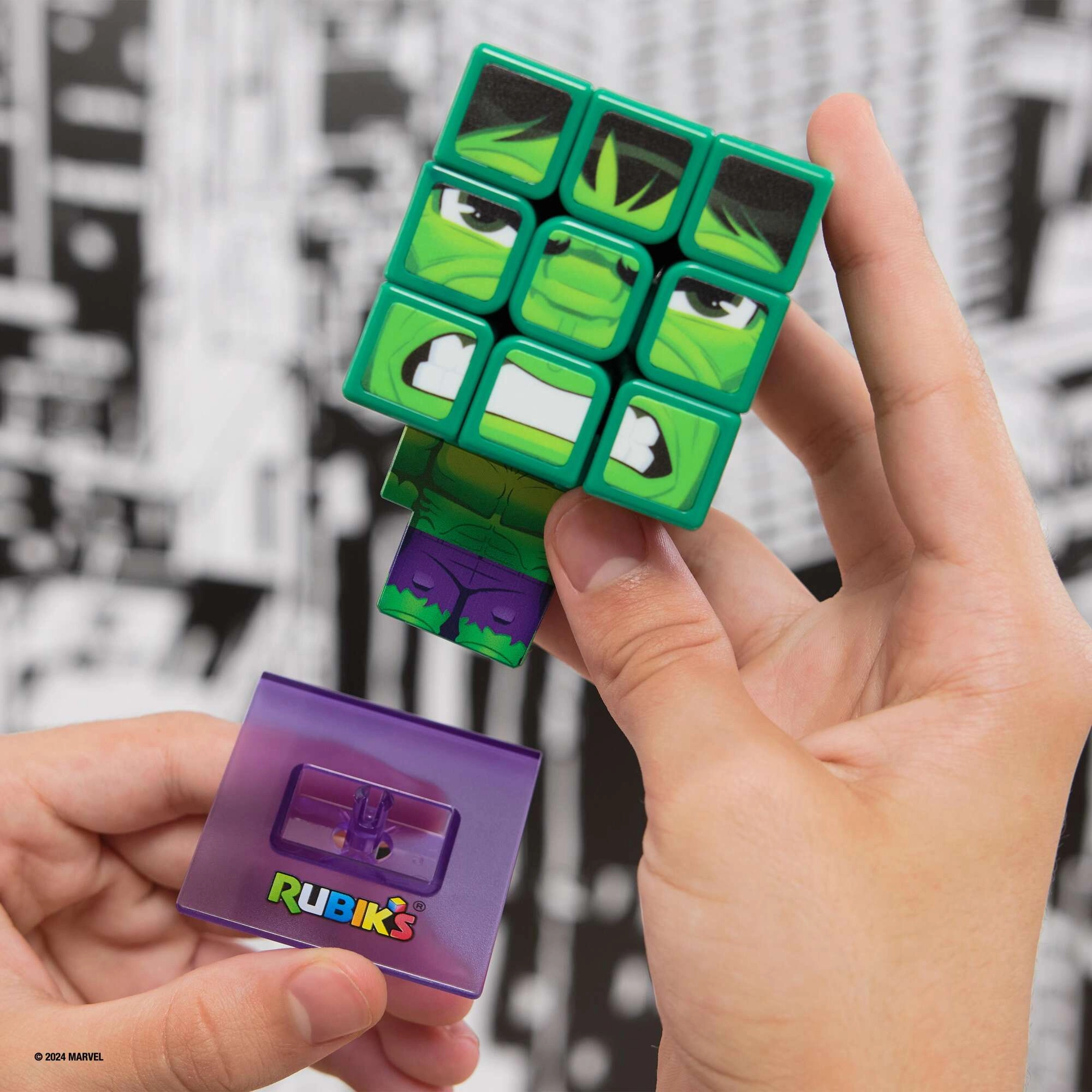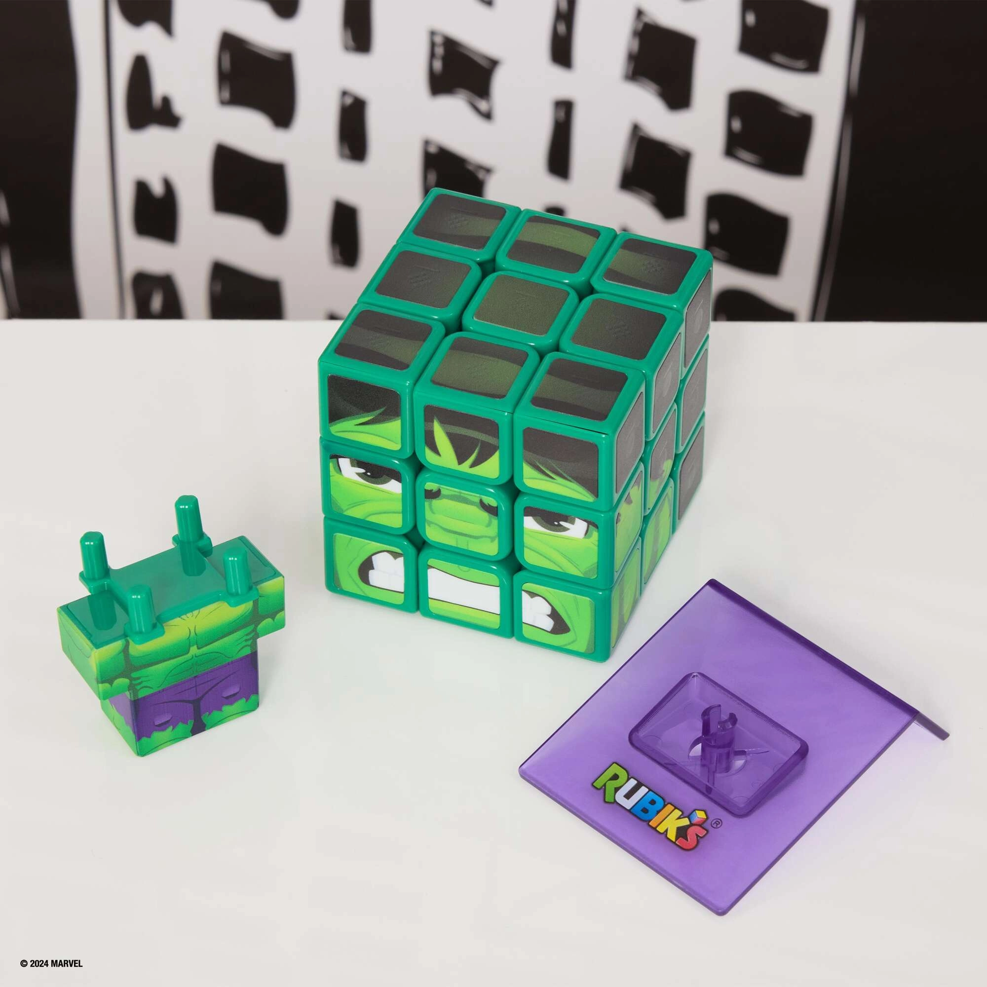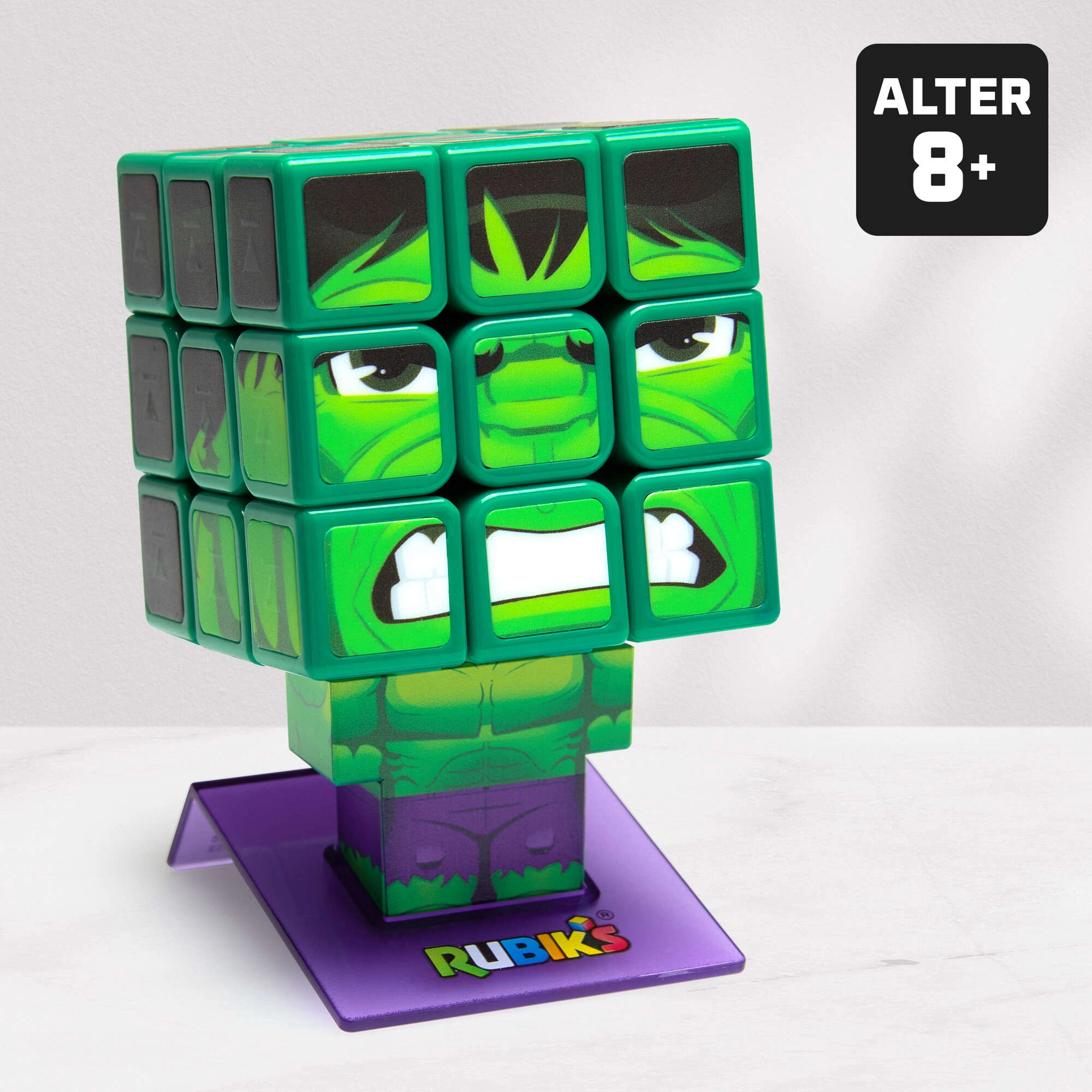 Odkrijte ikonično logično igračo v junaški preobleki: Rubik 3x3 HULK Cubers združuje klasičen sestavljivi izziv z atraktivnim motivom MARVEL. Zavrtite, premešajte in poravnajte delčke tako, da sestavite izrazit HULKOV obraz – nato kocko postavite na vijolično stojalo in dopolnite s trupom v stilsko razstavno figurico.