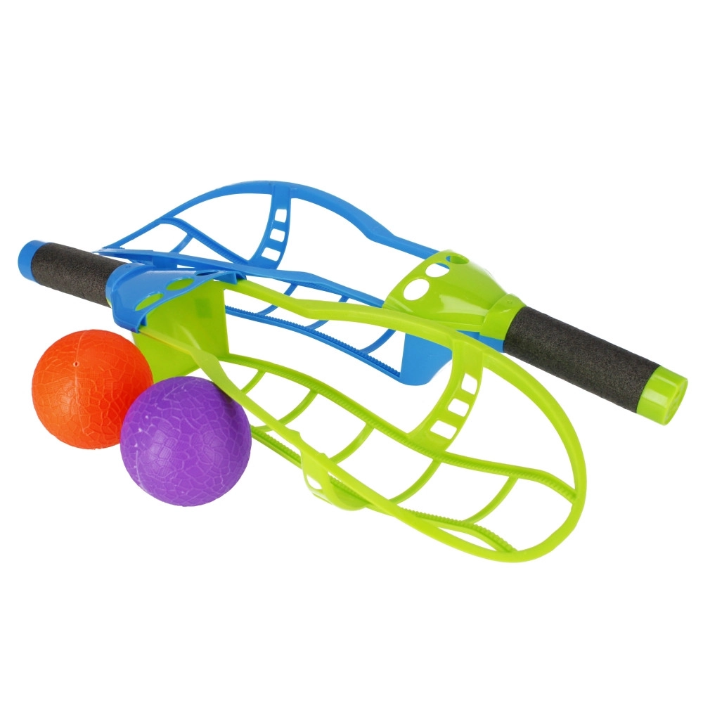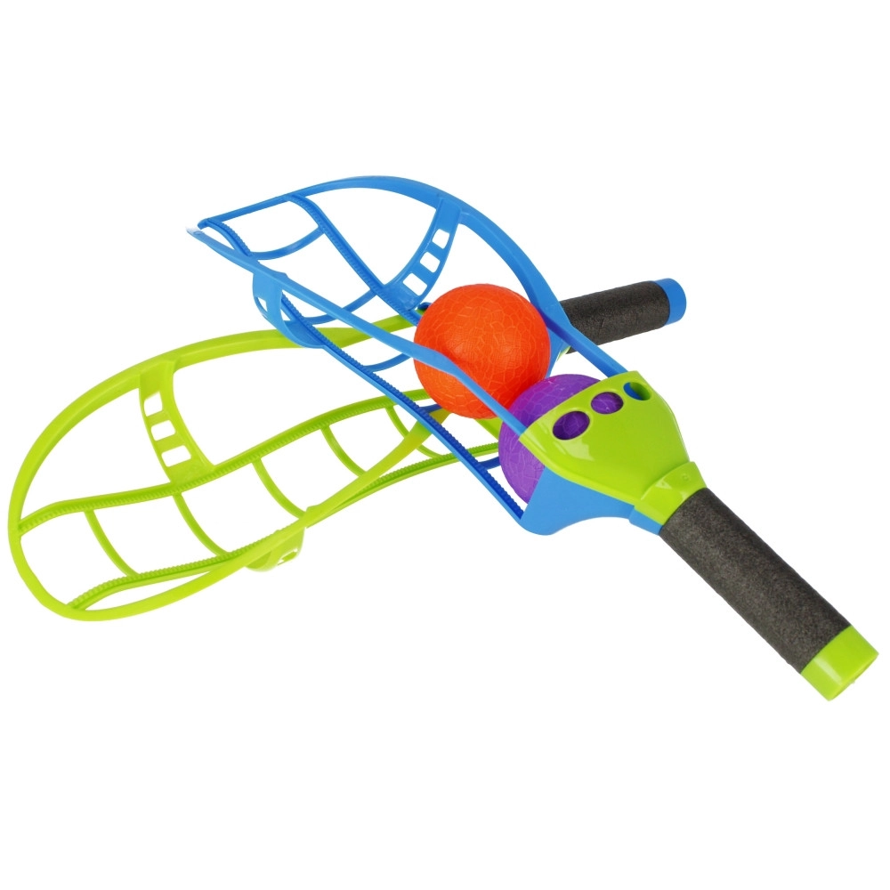 Komplet vsebuje dva lovilca in dve žogici – popolno za igro v dvoje. Konstrukcija podpira natančnost meta in hitre reakcije, medtem ko so mehkejše žogice varne in primerne za otroke. Odlična izbira za aktivno zabavo in razvoj spretnosti.