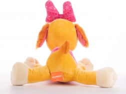 Ta velika plišasta SKYE v položaju na trebuščku je ustvarjena za crkljanje in igro. Ima vesel izraz z velikimi rožnatimi očmi, na glavi prisrčno pentljo, na telesu pa rožnat pulover z motivi snežink in dreves. Zaradi vezenih oči in nosu je varna tudi za mlajše otroke.