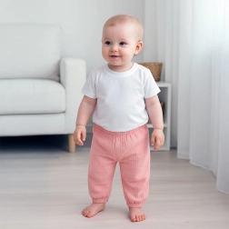 Stajliš in praktičen dvodelni komplet za otroke za vrtec in prosti čas. Vsebuje udobno bombažno majico s kratkimi rokavi ter zračne muslin hlače. Majica je brez zapenjanja in ima nežen ovratni rob za lahko oblačenje. Hlače iz kakovostnega muslina imajo ohlapen kroj ter elastičen pas in elastiko na hlačnicah, ki ne tiščita. Material je prijeten za občutljivo otroško kožo in enostaven za vzdrževanje. 100 % bombaž, certifikat OEKO-TEX STANDARD 100, zračno in odporno tudi pri pogostem pranju.