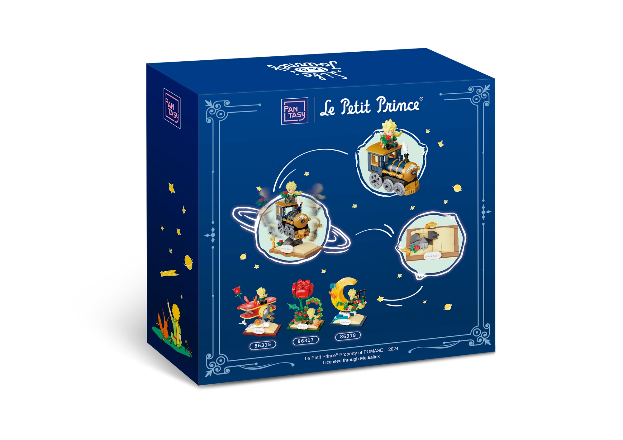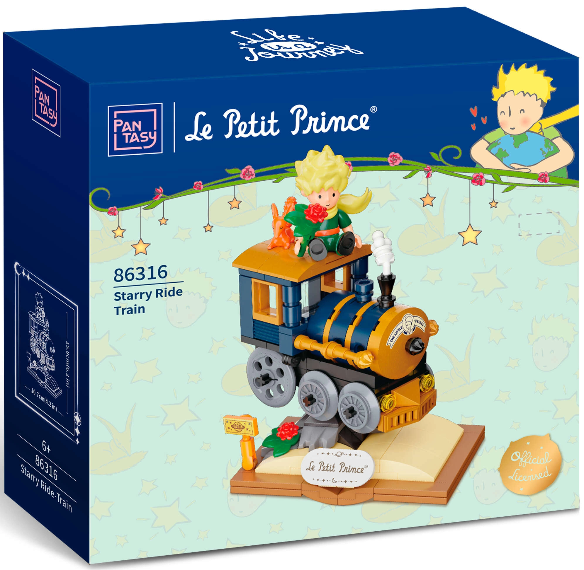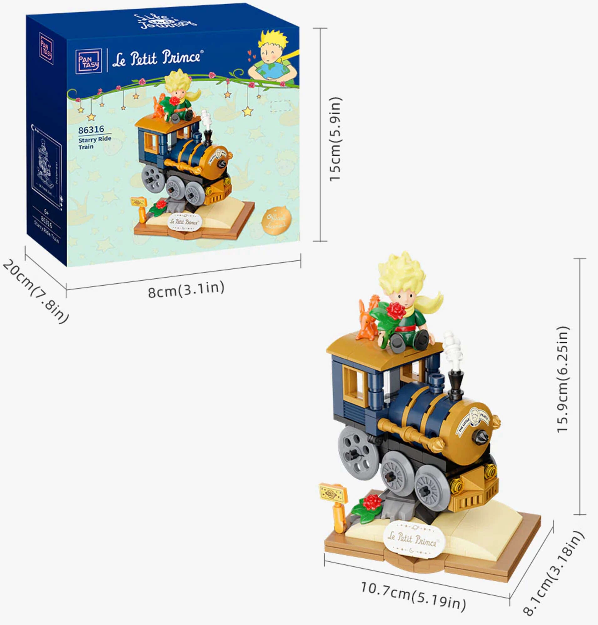 Ta sestavljanka iz kolekcije Pantasy – Starry Ride Series vas popelje v poetični svet Malega princa. Eleganten vlakec v tonih zlata, mornarsko modre in črne je postavljen na podstavek, ki spominja na odprto knjigo z napisom »Le Petit Prince«. Ne manjkajo simbolični detajli, kot so vrtnica, zvezde, oblački in figurica Malega princa z lisjakom.