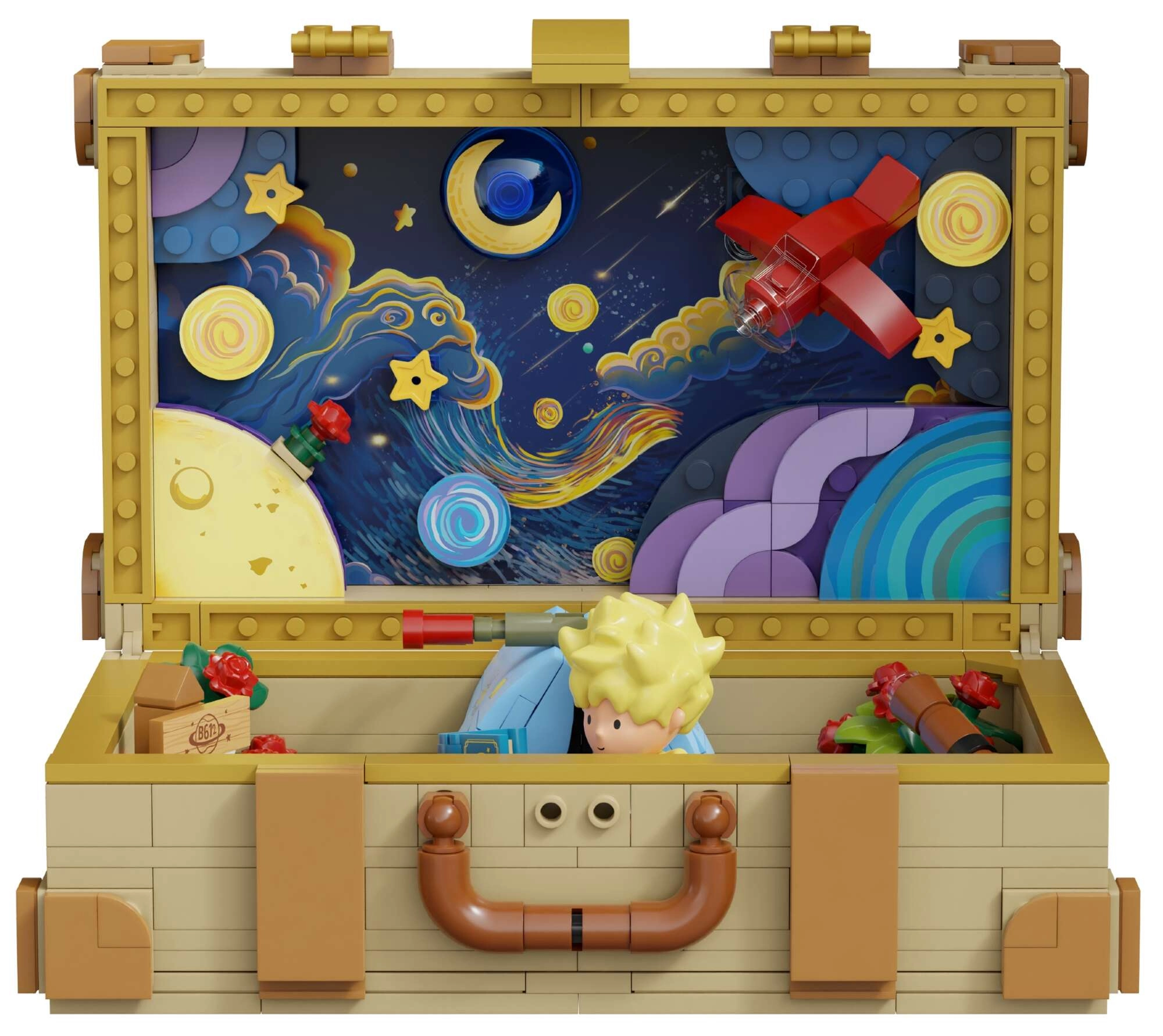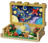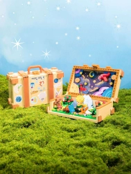 Stilni kovček služi kot okvir in kot shranjevalni prostor. Po odprtju razkrije barvito nebo z zvezdami in planeti ter ustvari impresivno ozadje za celotno dioramo.
