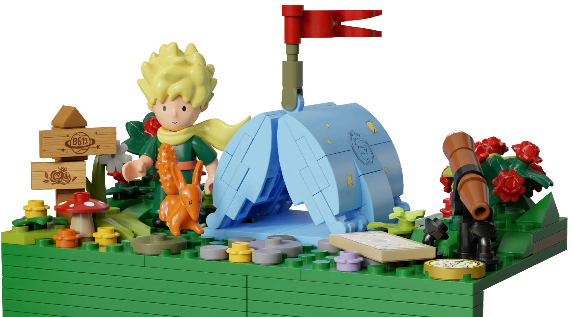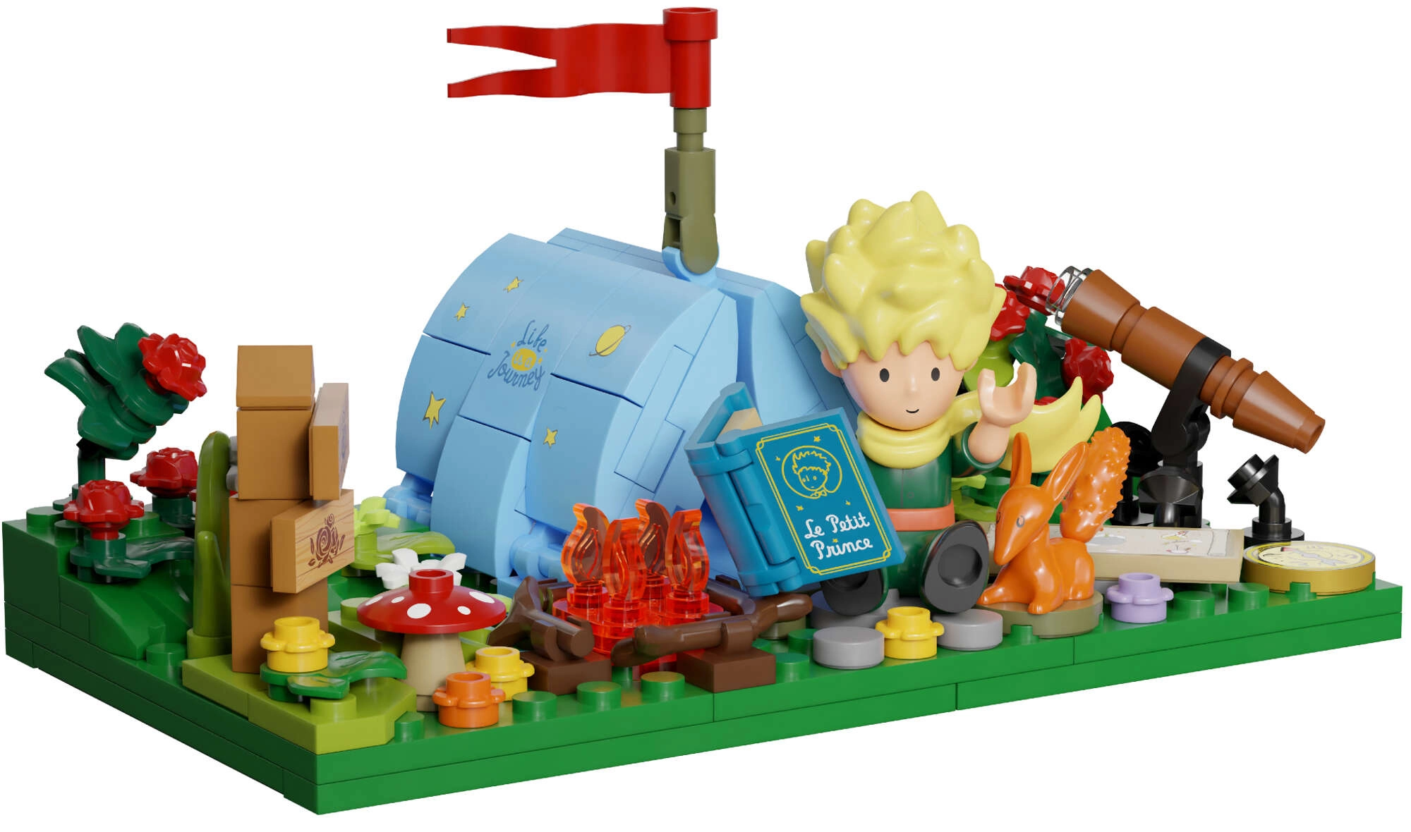 V notranjosti najdete figurico MALEGA PRINC A, lisico, vrtnico, kurišče, daljnogled in rdeče letalo – idealno za pripovedovanje lastnih zgodb.