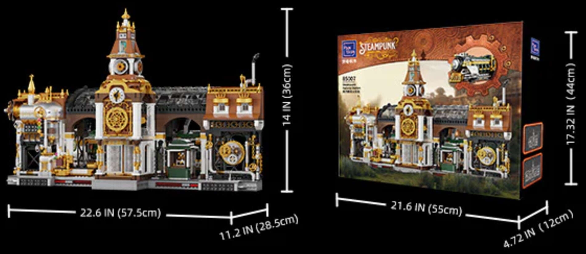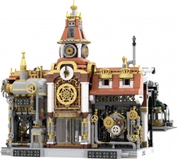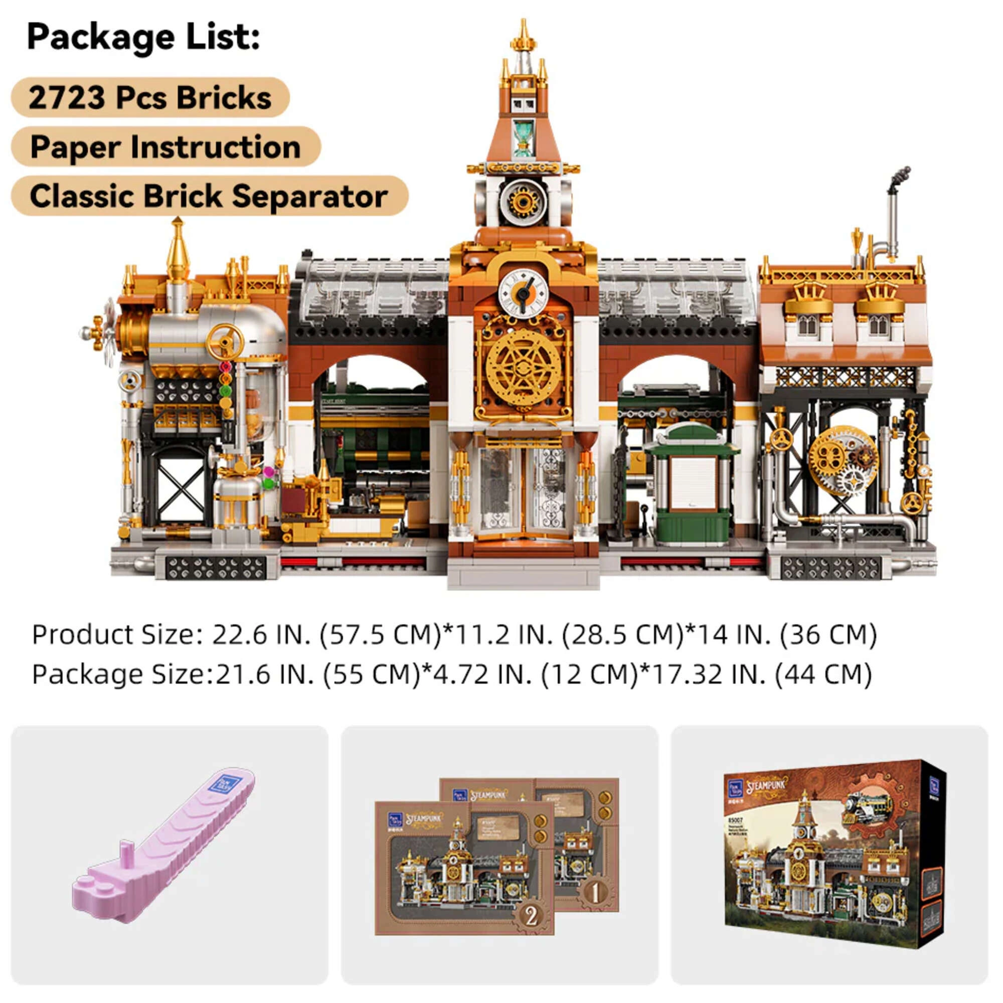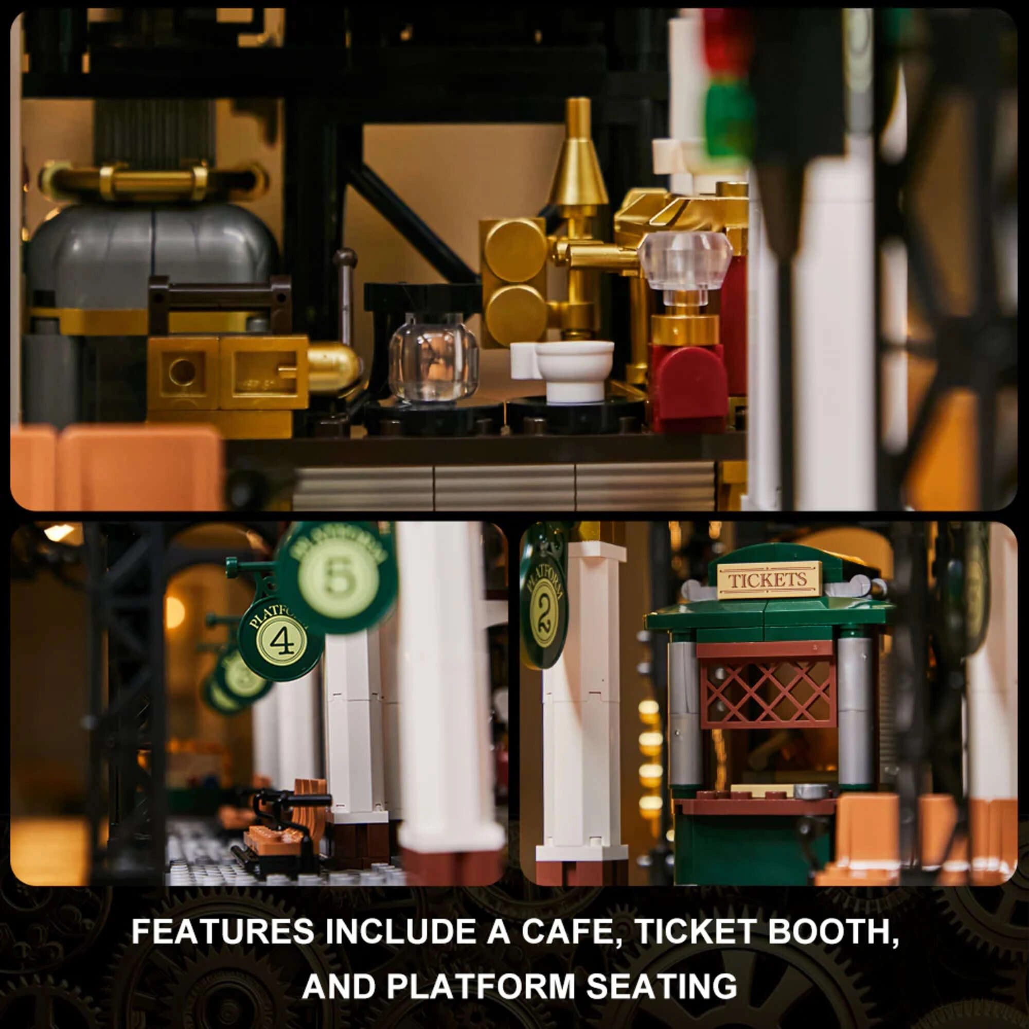 Vstopite v vzdušje parne dobe. Ta podrobna steampunk železniška postaja združuje medeninaste in bronaste tone z industrijskimi poudarki ter prinaša avtentičen značaj parnih strojev. Natančno zasnovani zobniški prenosi, cevi in fasadni dekor naredijo model za izrazit poudarek vsake zbirke in interierja.