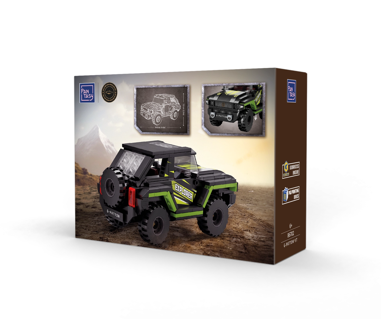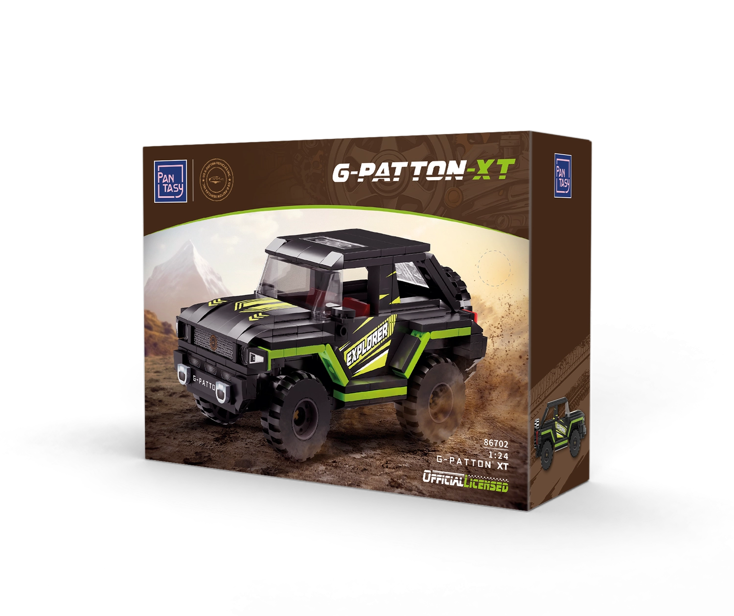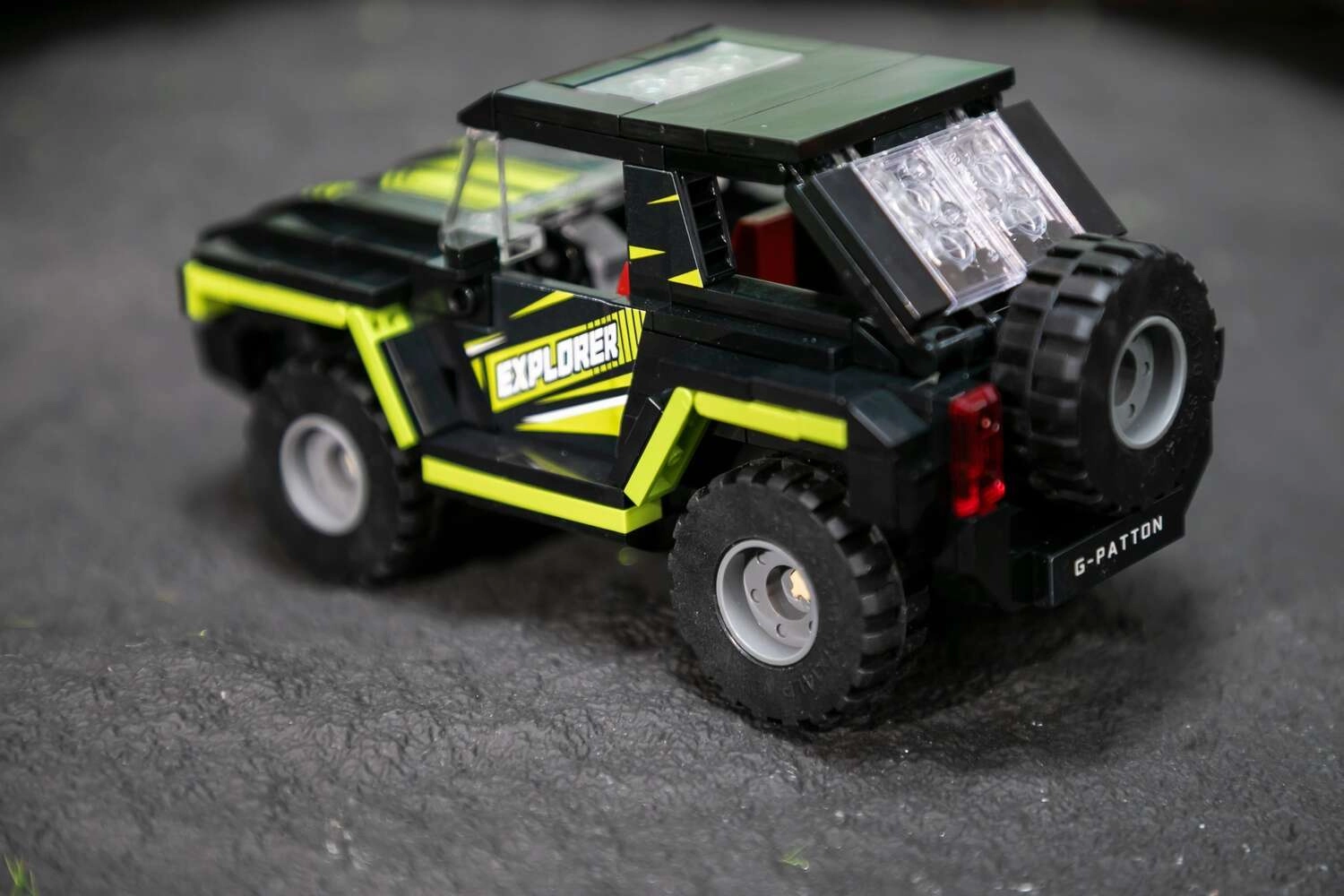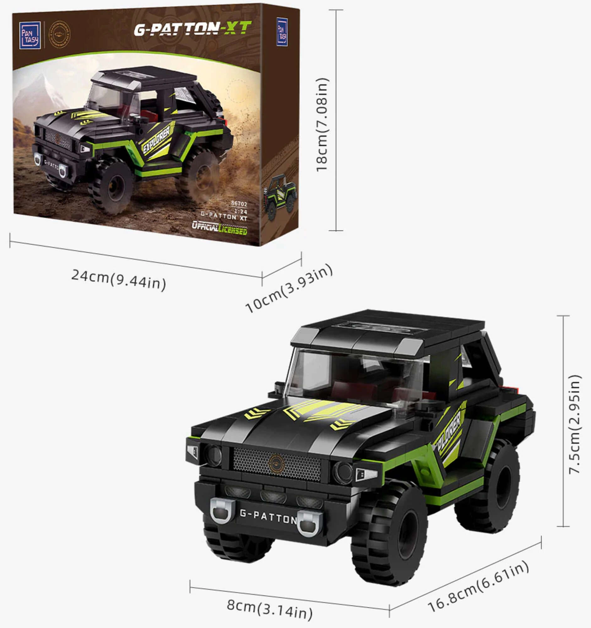 Ta stilski off-road model v črno–limetni kombinaciji navduši z realističnimi detajli: mogočnimi pnevmatikami, prozornimi »okni«, rezervnim kolesom zadaj ter potiski EXPLORER/G–PATTON. Zahvaljujoč natančno prilegajočim se delcem iz ABS plastike je gradnja prijetna, rezultat pa stabilen in vzdržljiv.