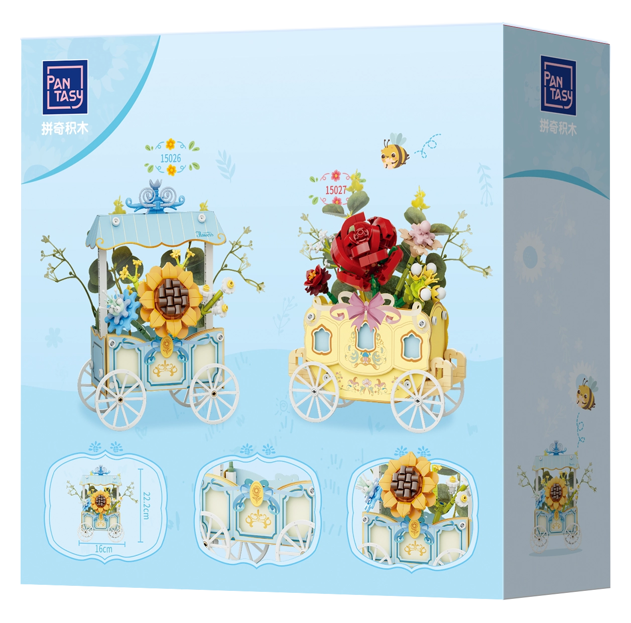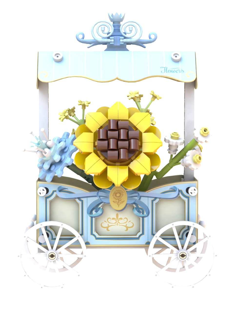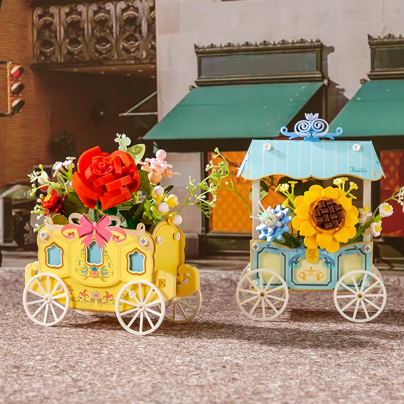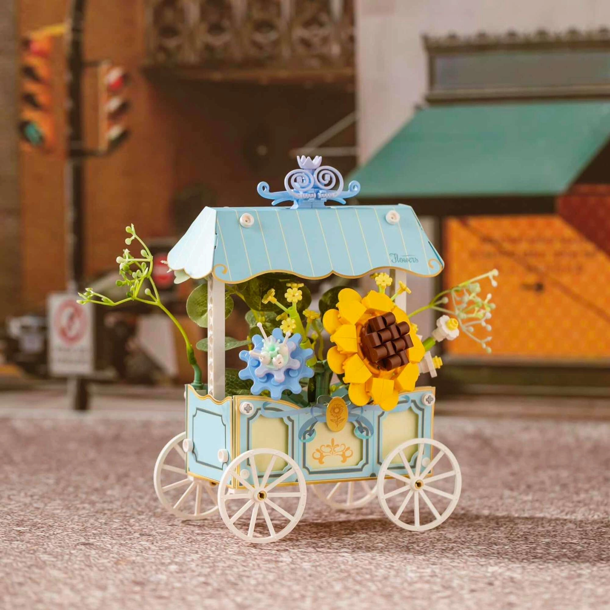 Ta prefinjen model združuje ustvarjalno sestavljanje in dekorativni dizajn. Voziček s štirimi naperečimi kolesi krasi črtasta strešica, nežni ornamenti in izrazita sončnica, dopolnjena z drugimi cvetlicami. Vsi motivi so tiskani neposredno na elementih, zato ostanejo dolgo časa lepi.