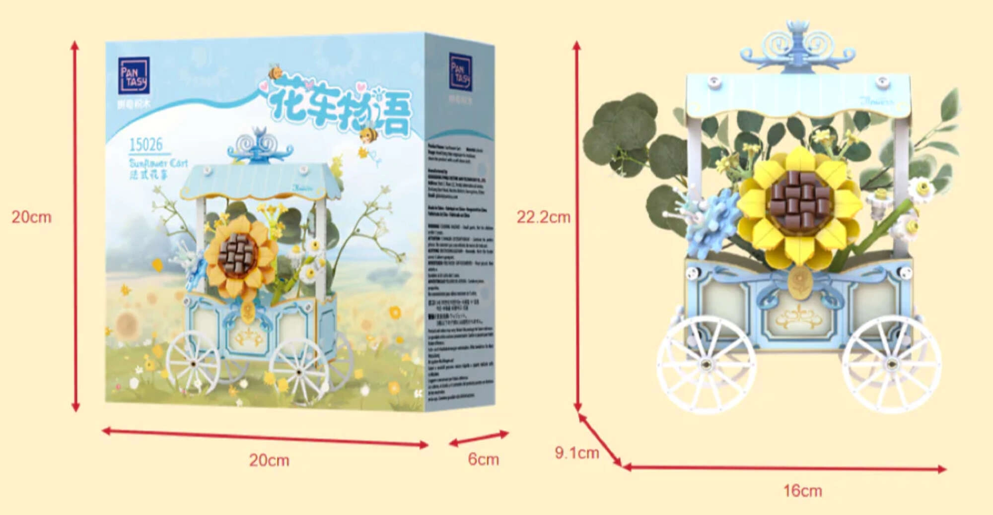 Uživajte v ustvarjalnem sestavljanju s čudovitim kompletom Pantasy, ki iz 265 kosov ustvari podroben cvetlični voziček s sončnico. Elegantne pastelne barve, tiskani detajli brez nalepk in dekorativni elementi iz njega naredijo stilno dekoracijo in odlično zabavo za otroke od 6 let naprej in odrasle zbiratelje.
