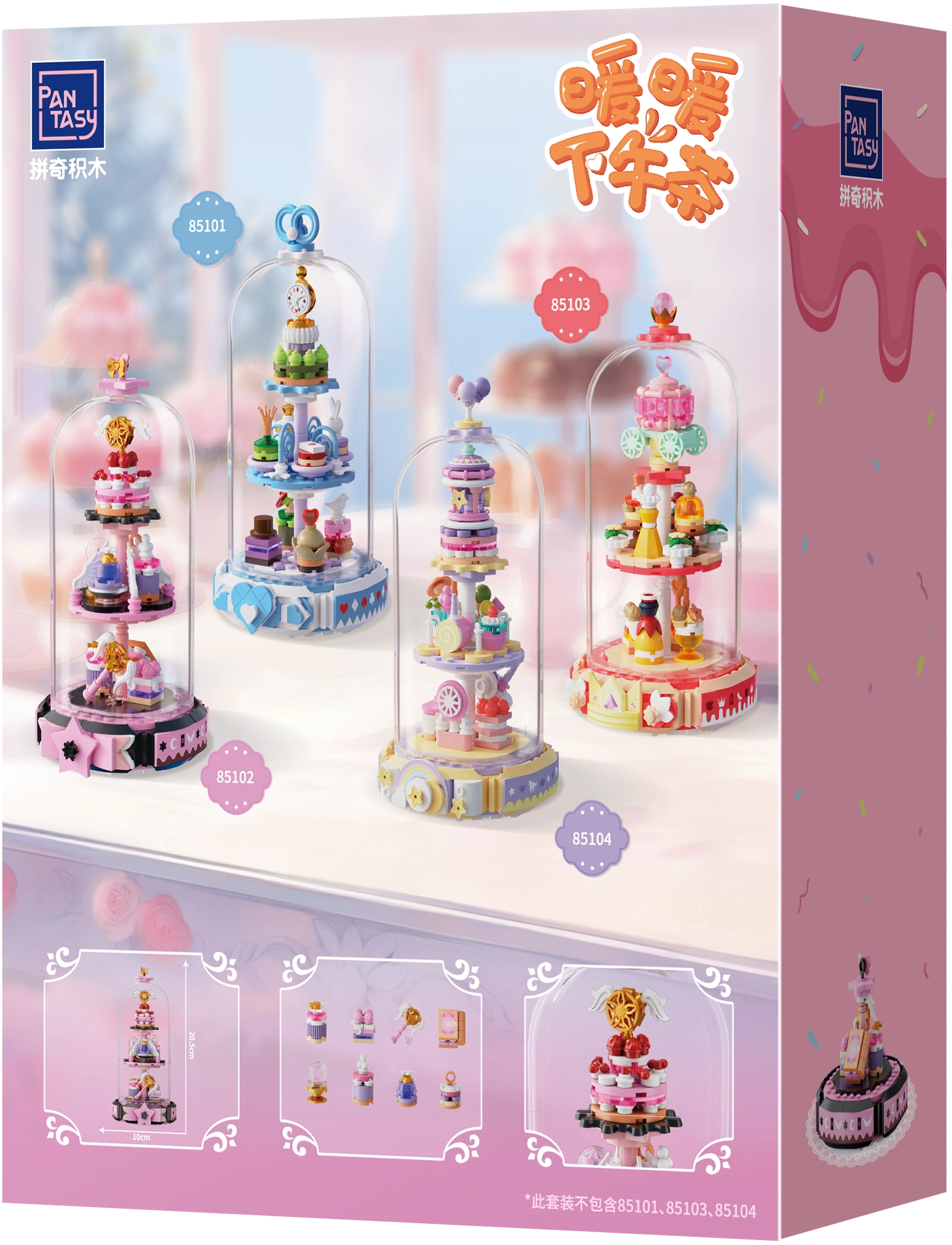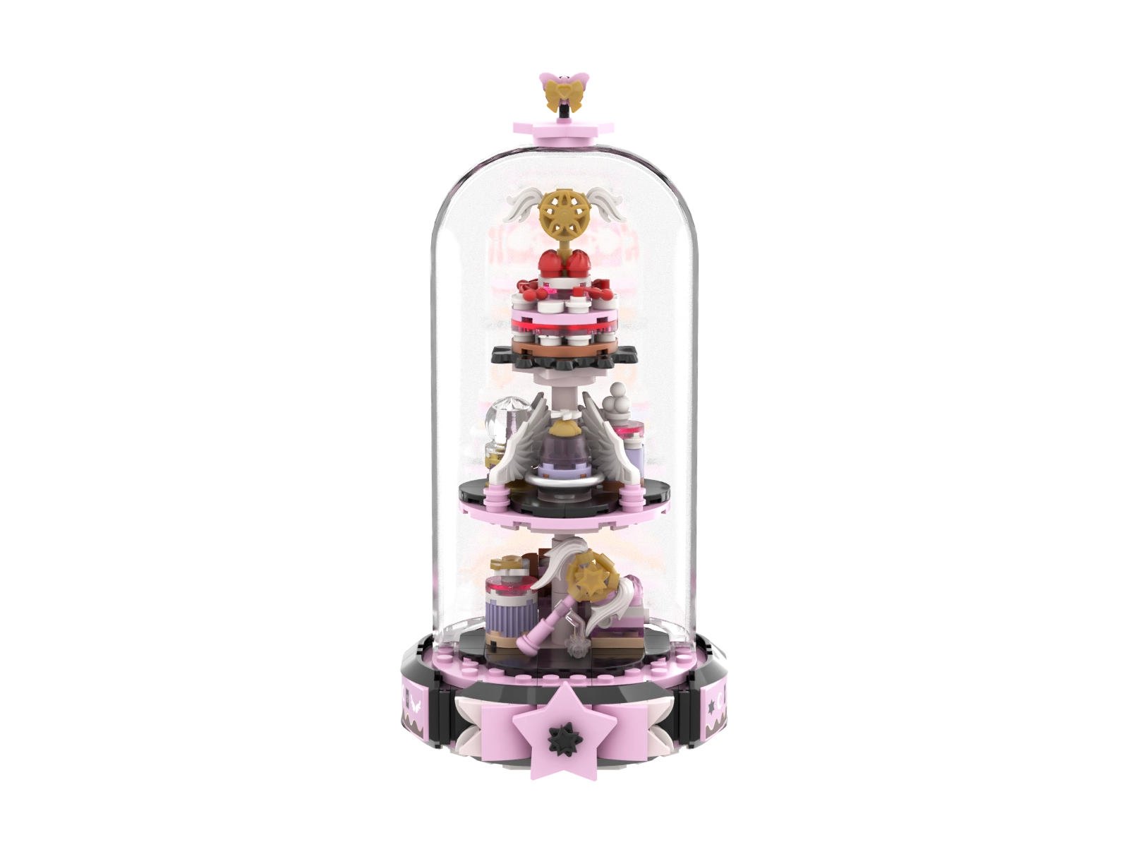 Odkrijte čar kreativnega sestavljanja z elegantnim modelom, ki navduši z nežno rožnato-zlato paleto in skrbno oblikovanimi elementi. Trinivojsko stojalo pod kristalno čisto kupolo deluje kot razstavni eksponat in po sestavi postane izviren okras otroške sobe ali delovne mize.