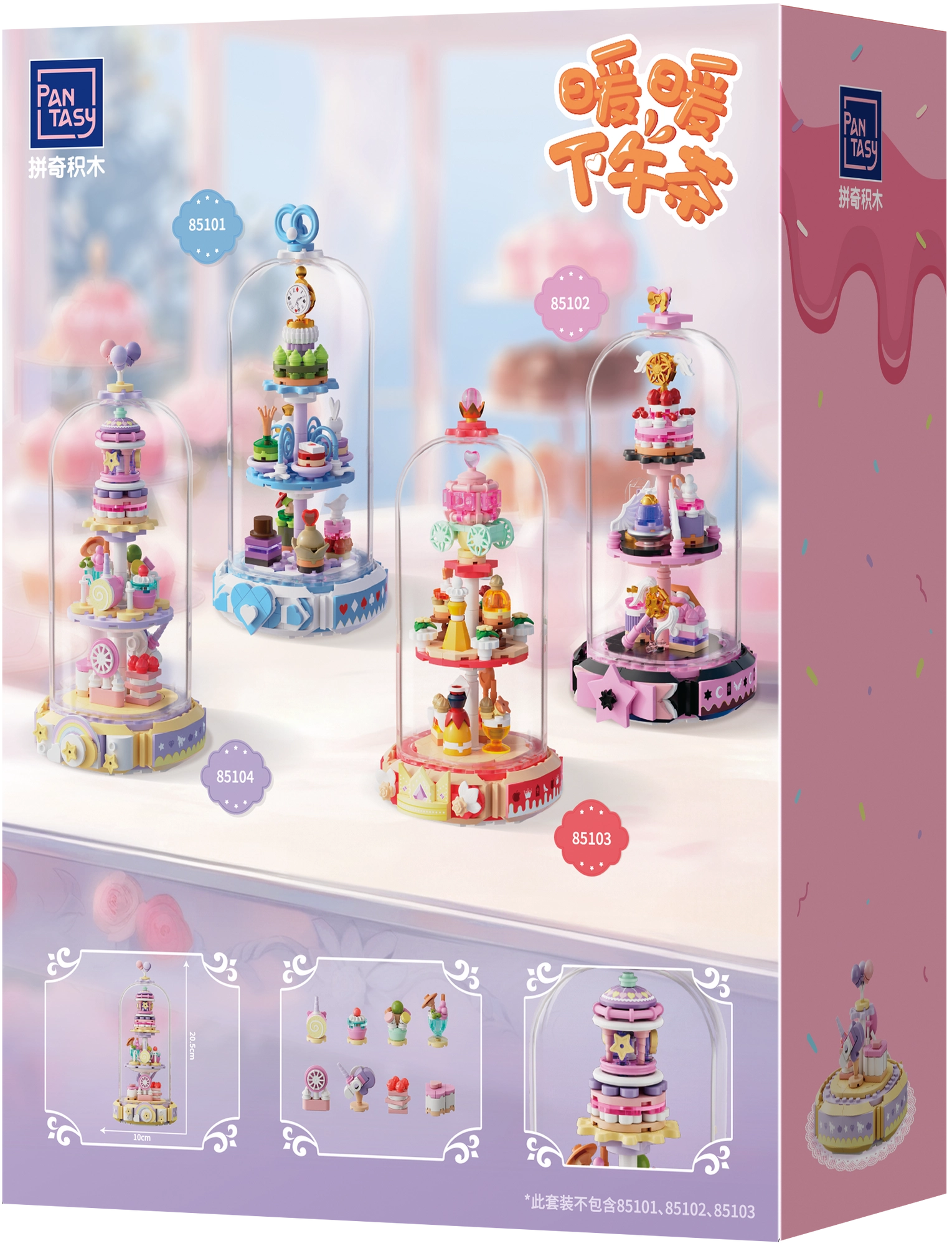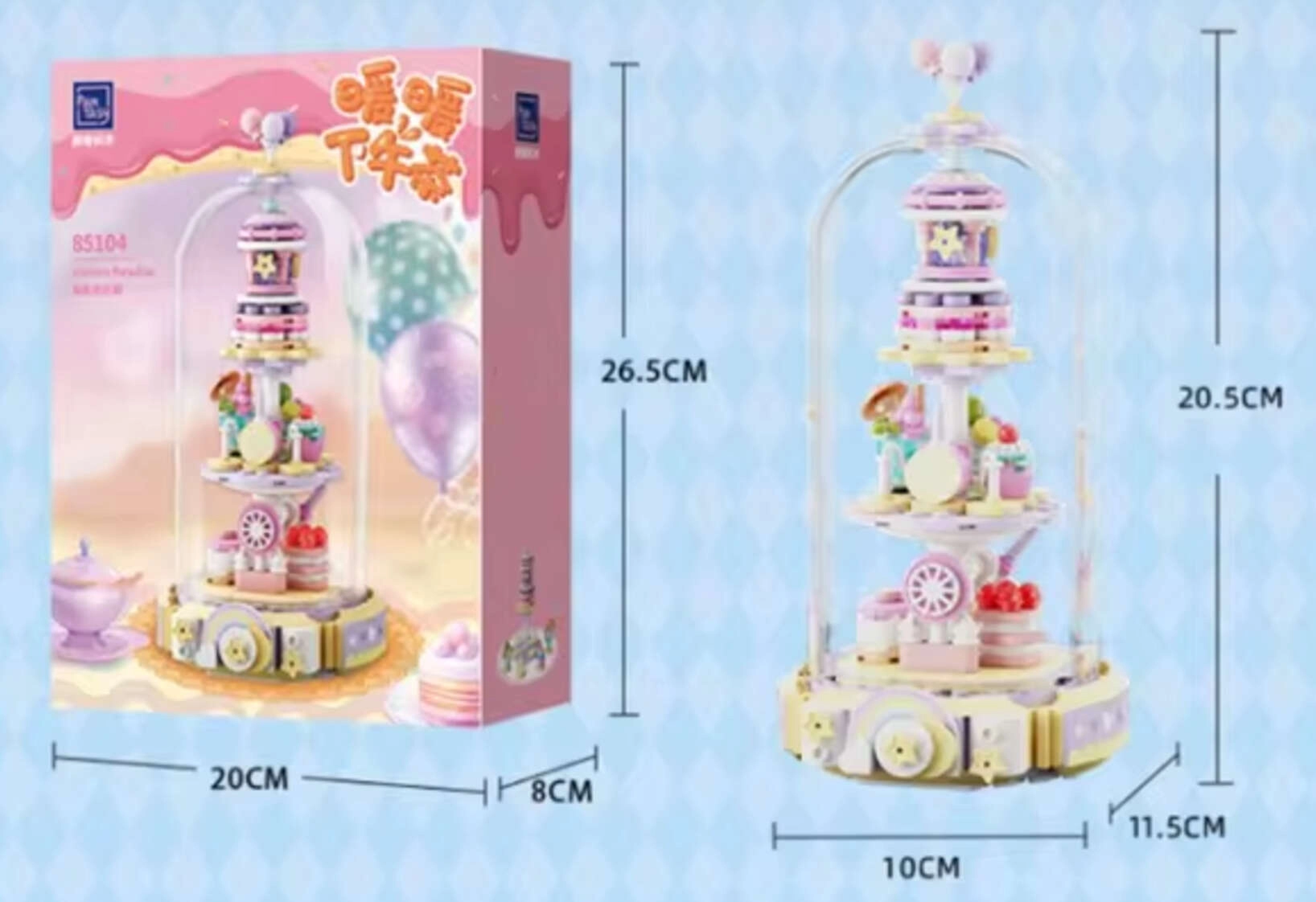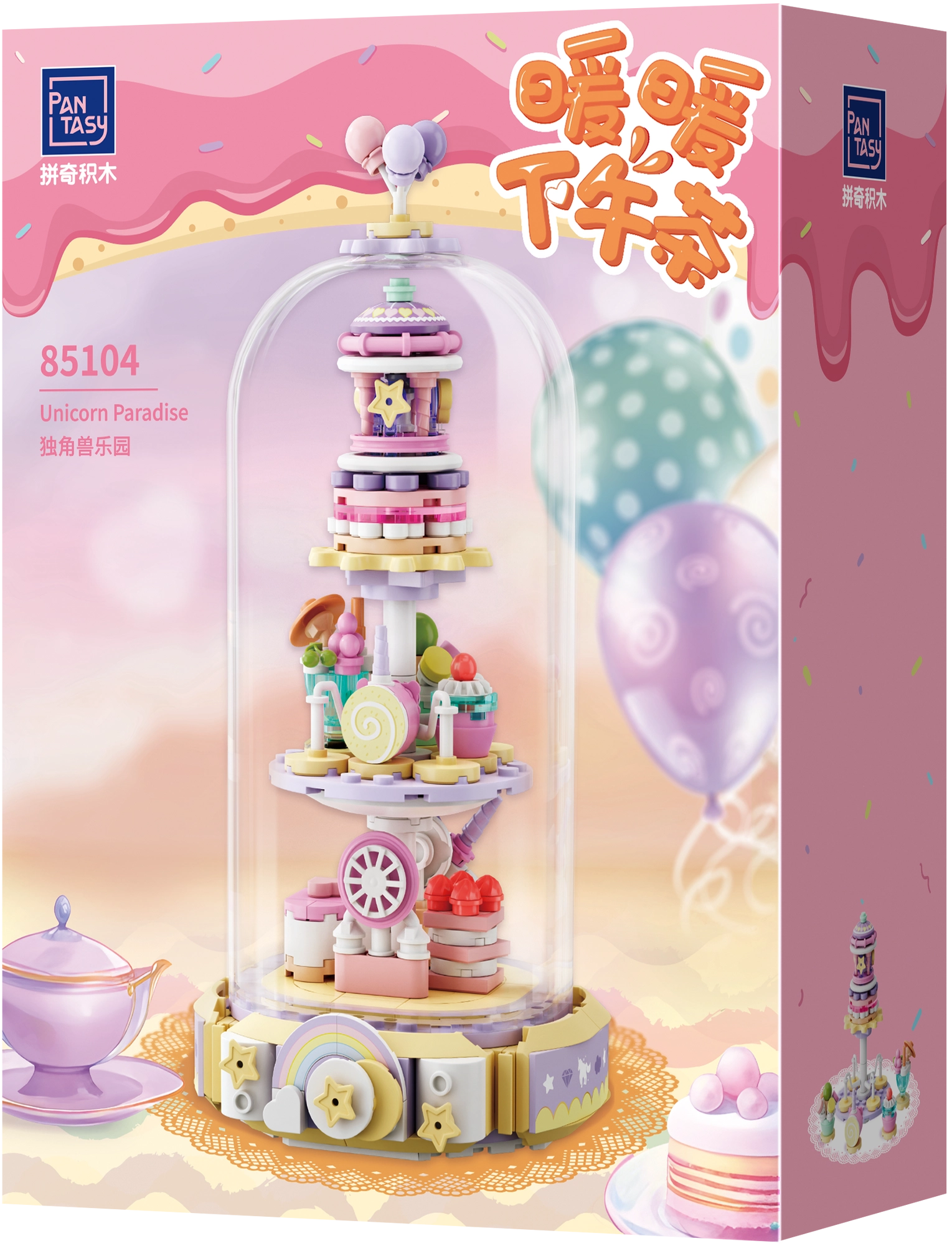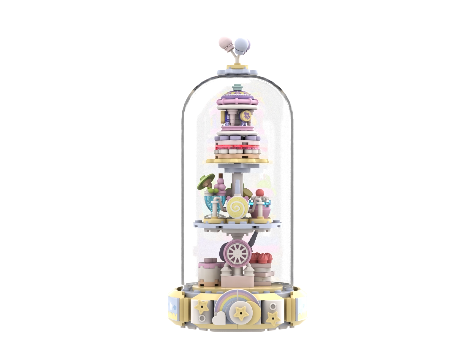 Vstopite v pravljično vzdušje s tristopenjsko “slaščičarno”, polno samorogov, zvezdic in srčkov. Prozorna kupola daje modelu eleganten razstavni značaj in ščiti drobne detajle. Nežni odtenki rožnate, modre in vijolične ustvarjajo očarljivo dekoracijo za otroško sobo ali zbirateljsko polico.