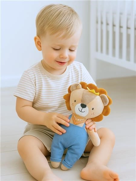 Ta plišasti lev z ljubko krono in modrimi hlačkami spodbuja fino motoriko in domišljijo. Odličen je za pomiritev ob uspavanju ter kot zvest prijatelj pri dnevnem odkrivanju. Kakovostna izdelava in vezeni detajli zagotavljajo varno uporabo brez drobnih odstranljivih delov.