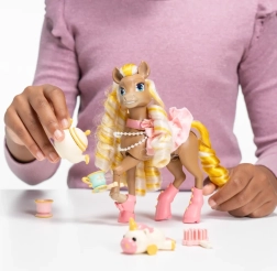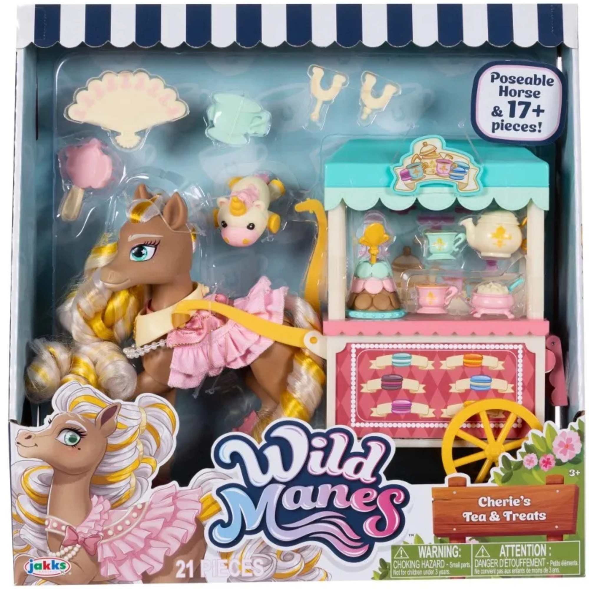 Očarljiv set, navdihnjen s serijo WILD MANES, prinaša figurico ponija Cherie s čudovitim čajnim vozičkom in bogatimi dodatki za ustvarjalno igro. Poni ima premične okončine, dolgo grivo z zlatimi prameni in lahko drži dodatke zahvaljujoč sponkam v obliki podkve. Idealno darilo za otroke od 3 let, ki imajo radi domišljijske zgodbe in trendovske čajne zabave.