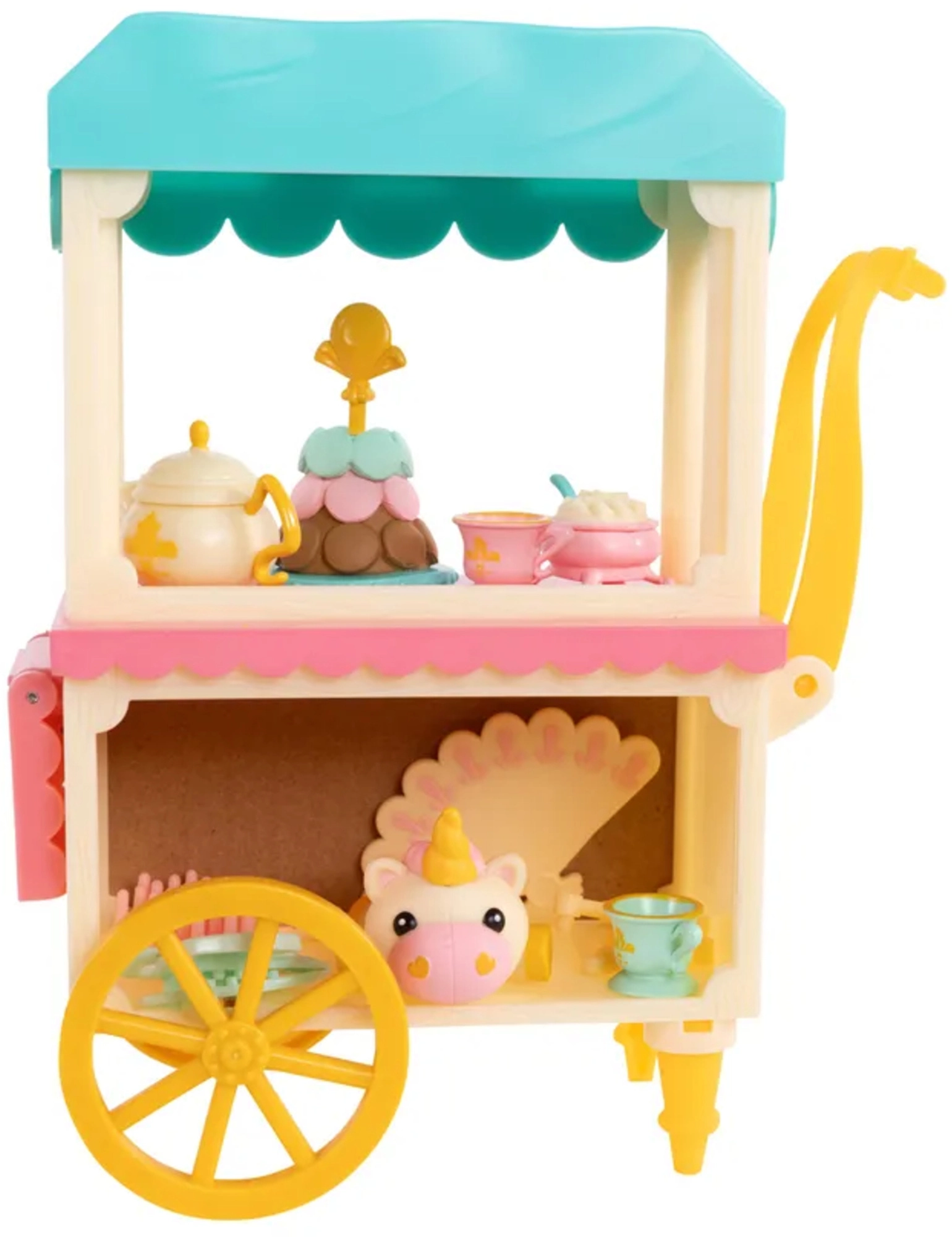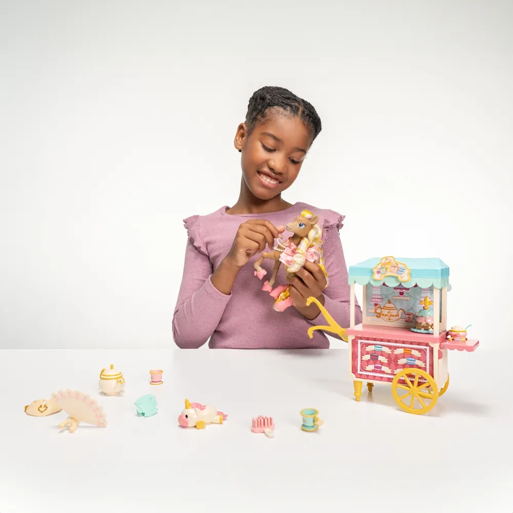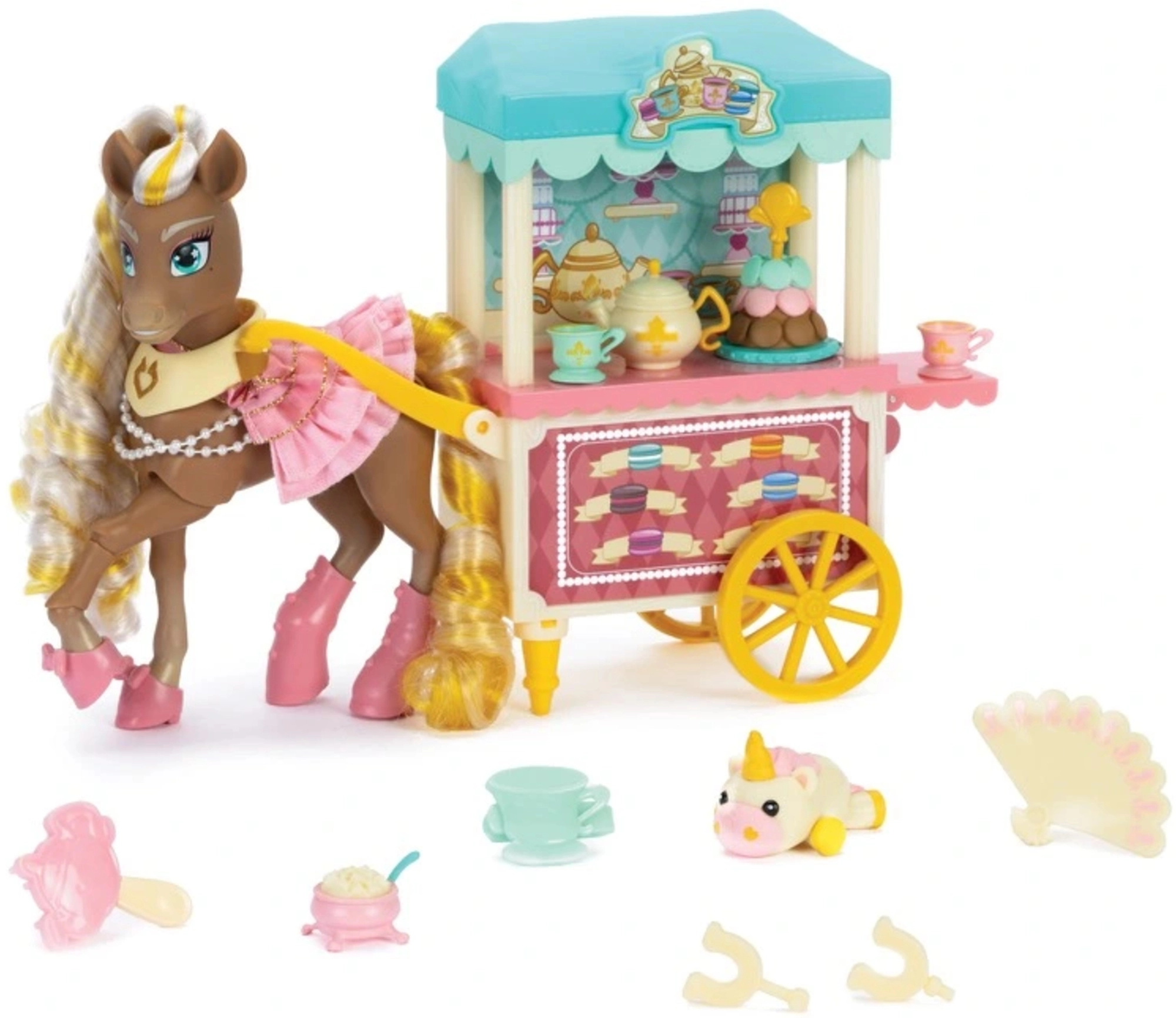 Sestavni del je velik voziček Tea & Treats z dvojnimi voznimi kolesi, čajnik s čajem, skodelice, makroni na stojalu in druge ljubke malenkosti. Voziček lahko s pomočjo vprežnega droga pripnete k poniju in se odpravite na zabavo. Zahvaljujoč sponkam v obliki podkve lahko Cherie trdno drži izbrane dodatke.