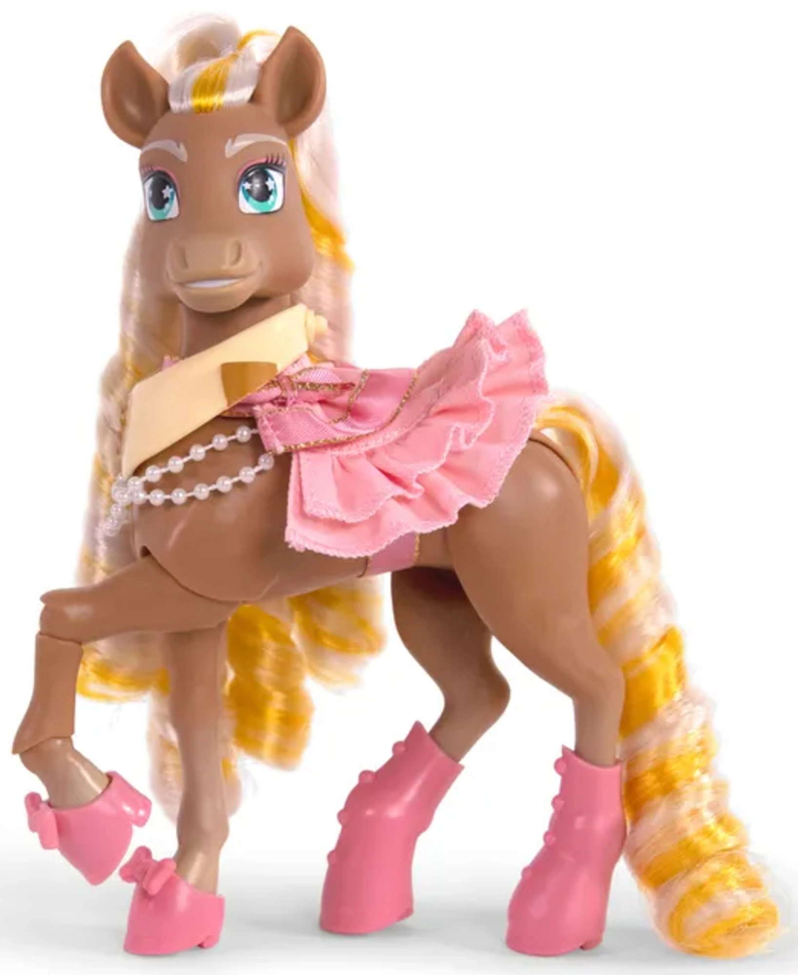 Poni s premičnimi okončinami, dolgo grivo z zlatimi prameni in možnostjo držanja dodatkov zahvaljujoč sponkam v obliki podkve.