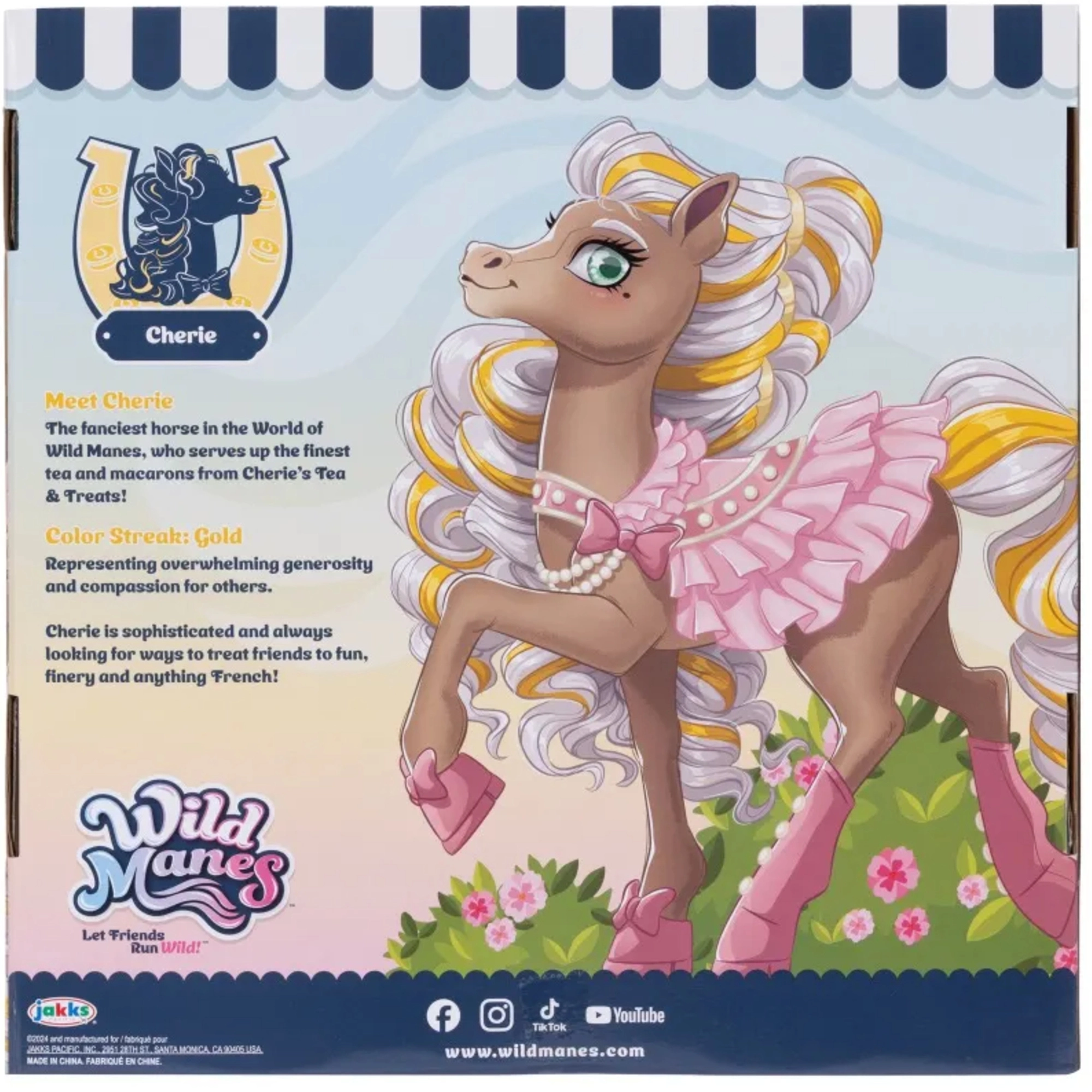 Figurica Cherie v rožnatem krilcu in čeveljčkih je pripravljena na čajno zabavo. Zahvaljujoč premičnim nogam jo lahko enostavno postavite v različne poze in poustvarite priljubljene prizore iz sveta WILD MANES. Dolga, valovita griva in rep z zlatimi črticami naravnost vabita k česanju in stiliranju.