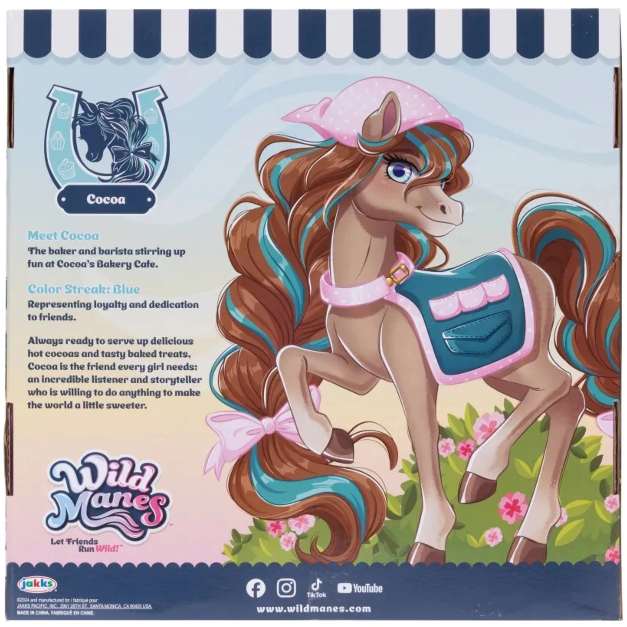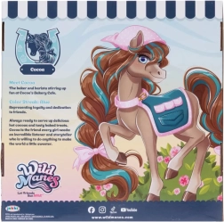 Konjiček Cocoa iz priljubljene serije WILD MANES prihaja z dovršenim vozičkom Bakery Café, kjer lahko streže napitke in sladice. Figurica ima podrobno izdelano grivo s kitkami, izrazite oči in nosi stajliš predpasnik – pripravljena na vsako pustolovščino. Zahvaljujoč sponkam v obliki podkve lahko Cocoa drži dodatke in zlahka odigra različne prizore.