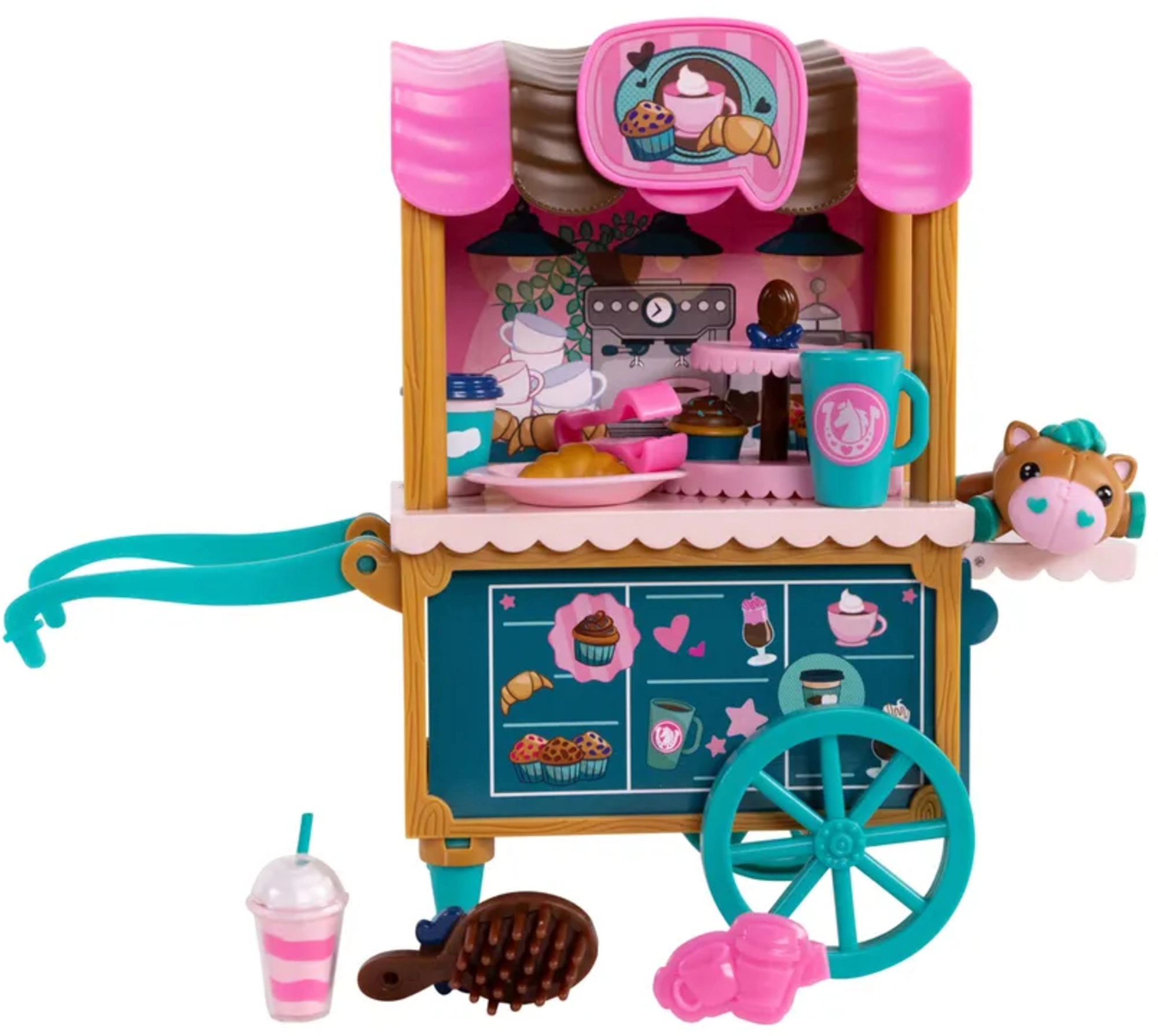 Voziček ima vrtljiva kolesca, ročaj in poličke za dobrote, barvito strešico in kavarniško grafiko. Set vključuje tudi strežni in pekovski pribor, majhnega ljubljenčka in krtačo za urejanje grive. Vse je zasnovano za kreativno igro vlog, razvoj fine motorike in socialne igre.