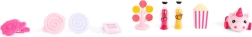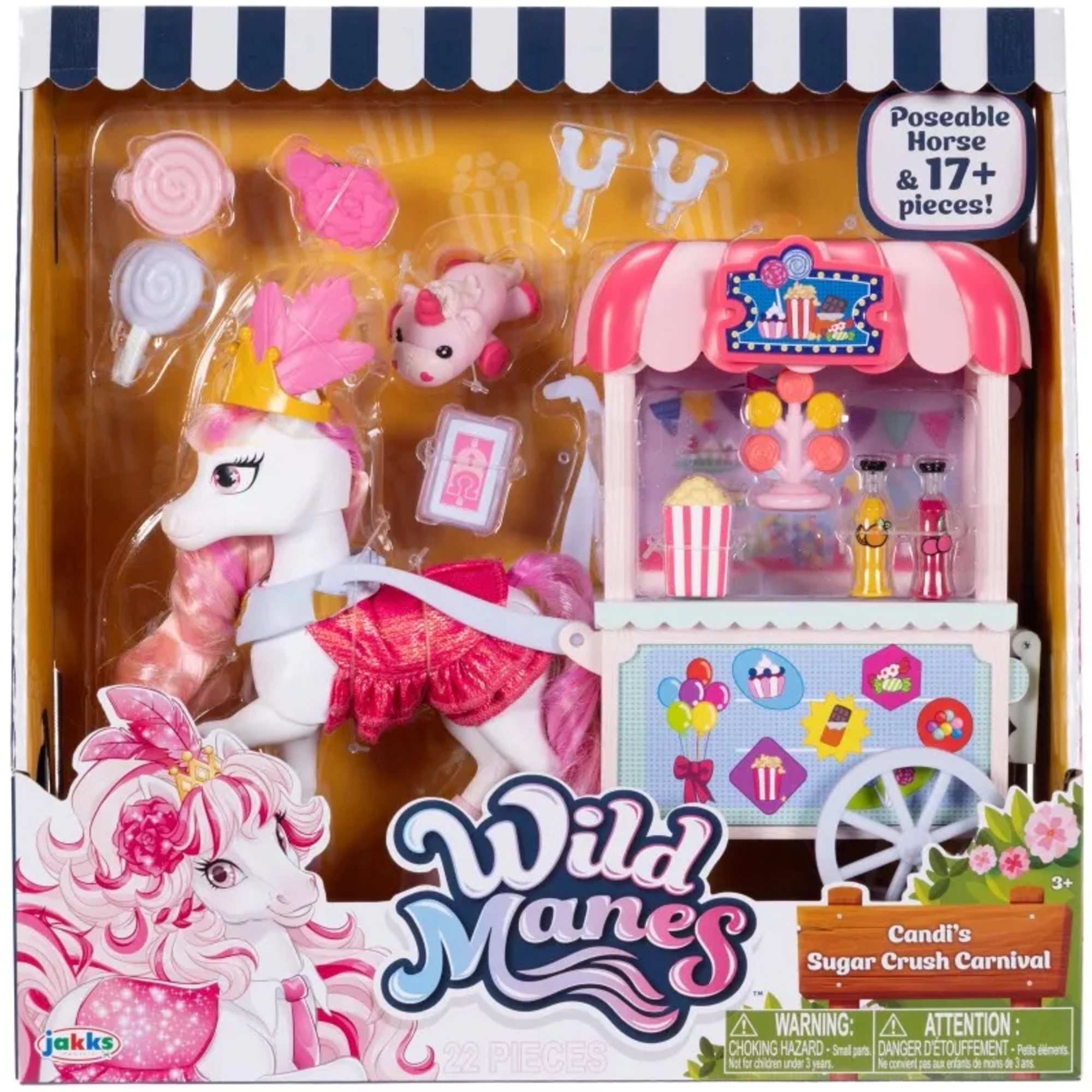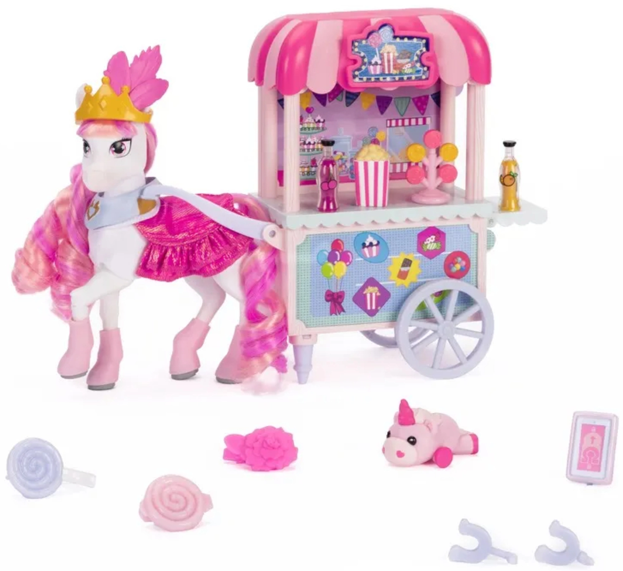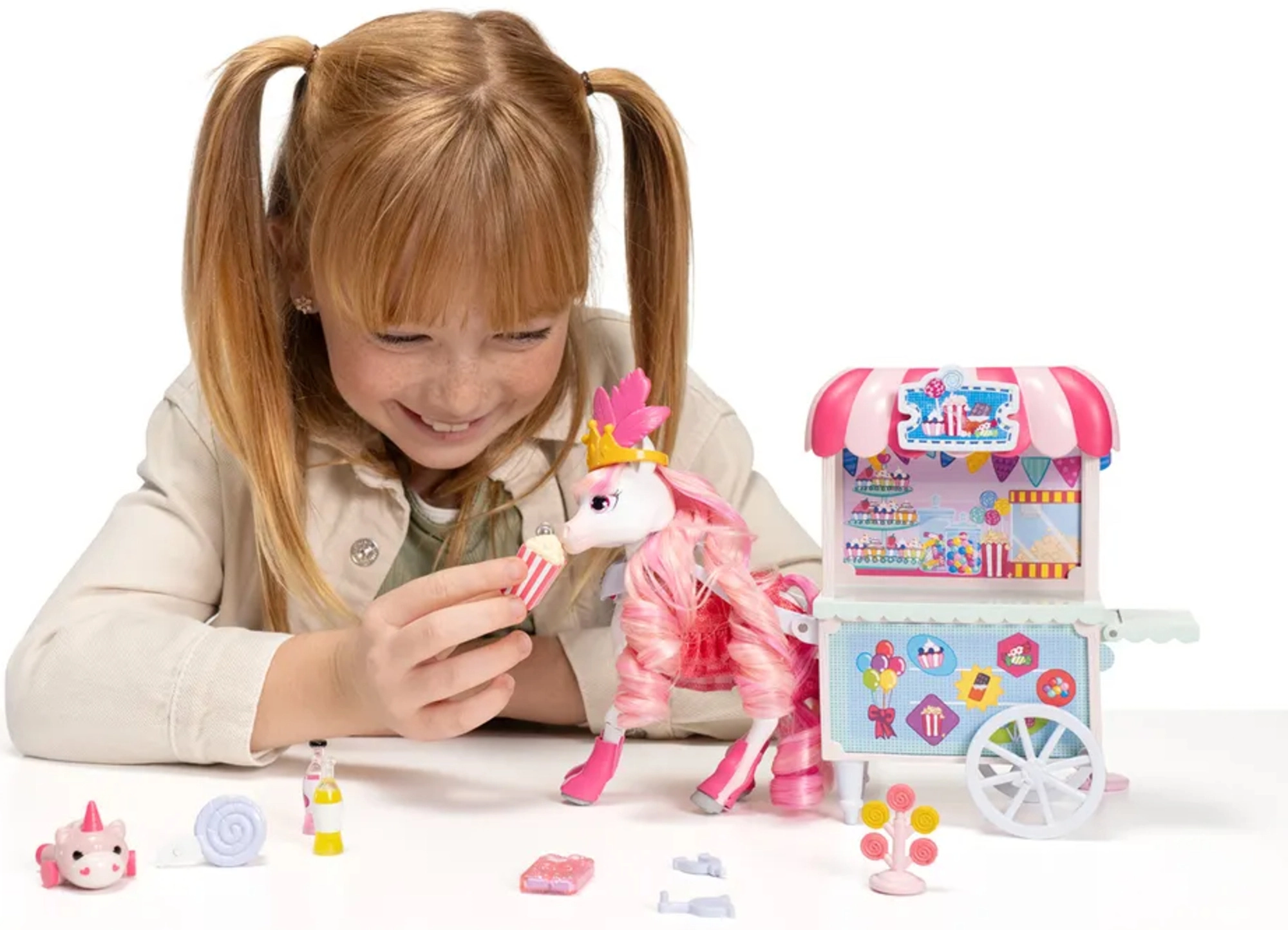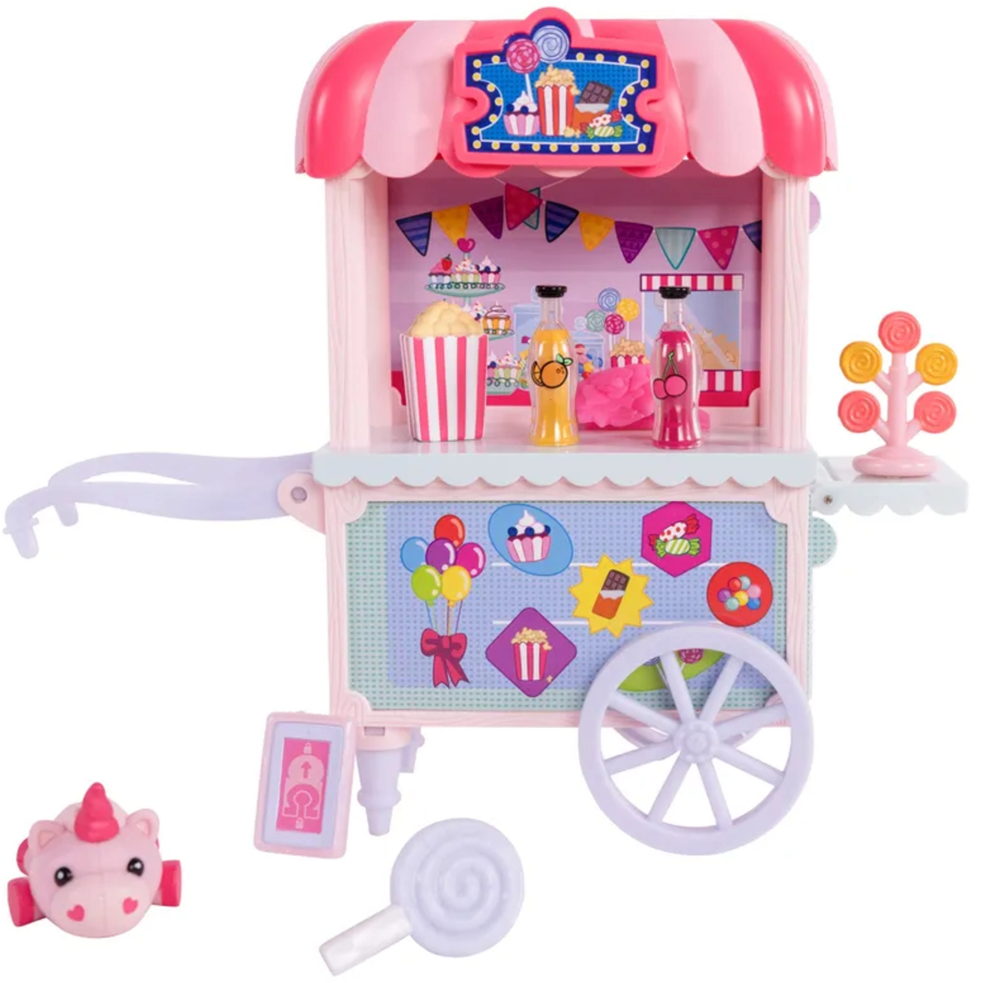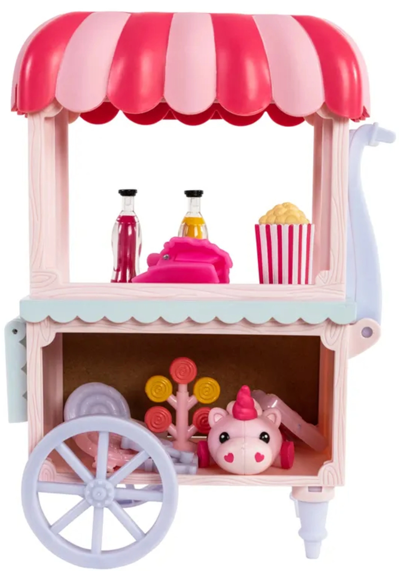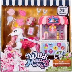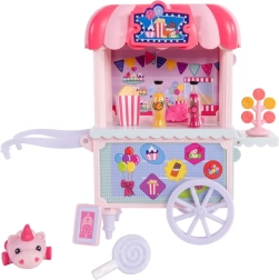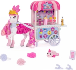 Barvita stojnica Sugar Rush Carnival s črtasto strešico in funkcionalnimi kolesci je pripravljena na prodajo pokovke, lizik in napitkov. S pomočjo vlečne palice/ojnice lahko voziček priključite na Candi in se odpravite na sladko vožnjo po mestecu Mane Lane. Priloženi so tudi drobni dodatki za nego in oblikovanje – krtača, sponke in drugi.