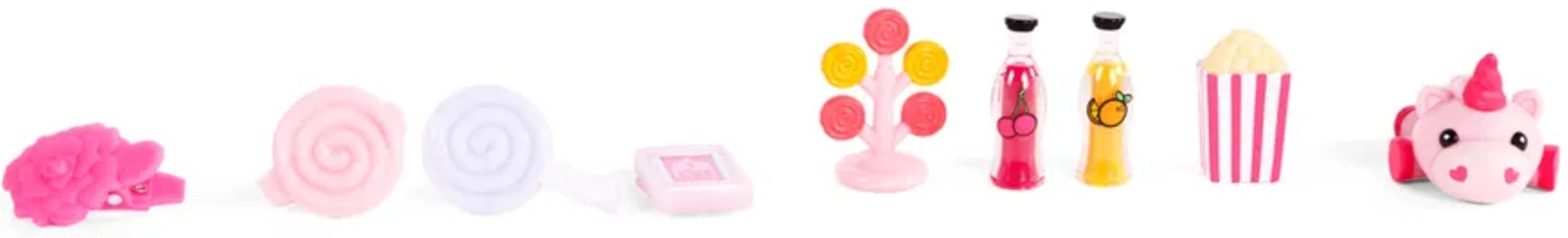 Pokovka, lizike, napitki in druge malenkosti za realistično igro. Ne manjkajo krtača in sponke za urejanje grive.