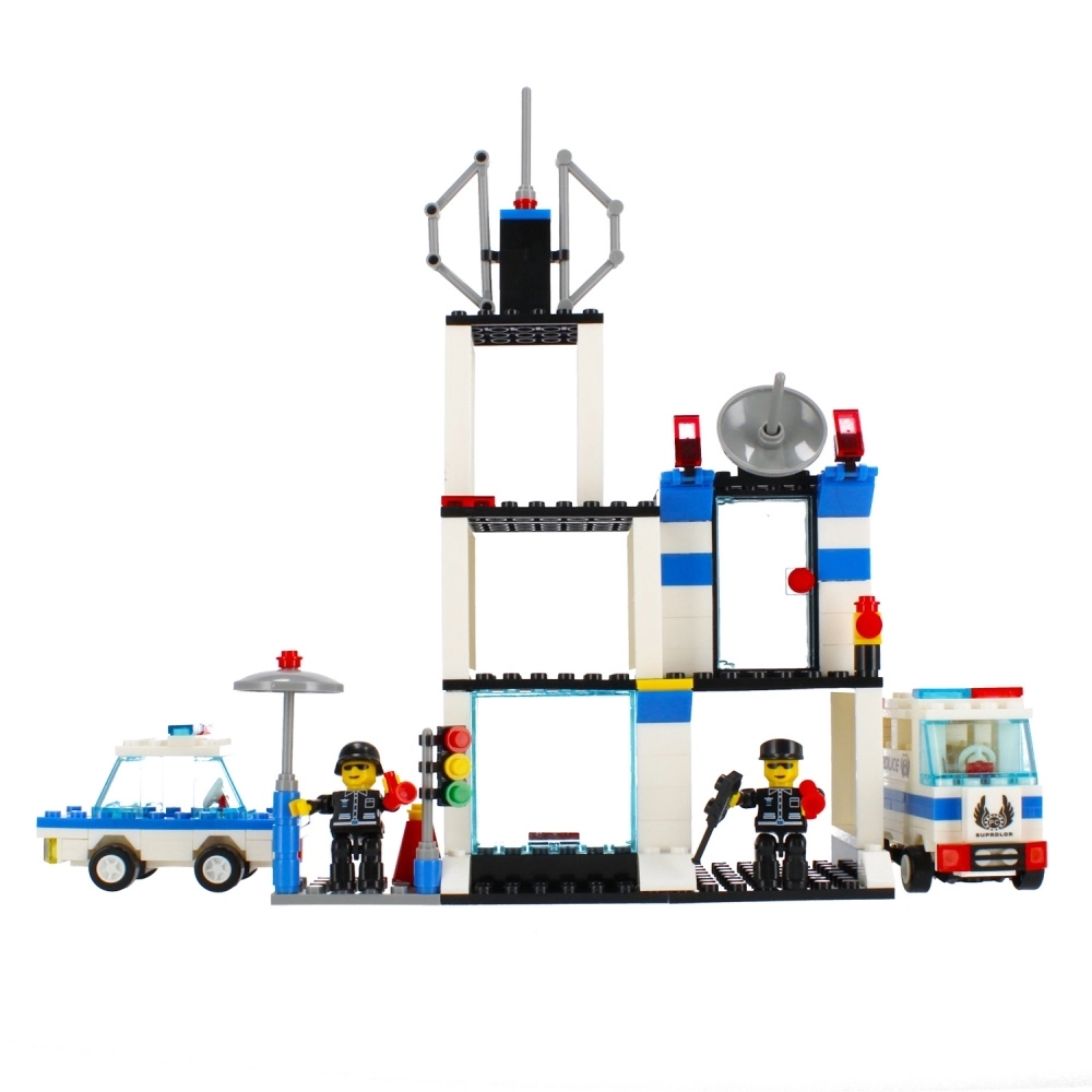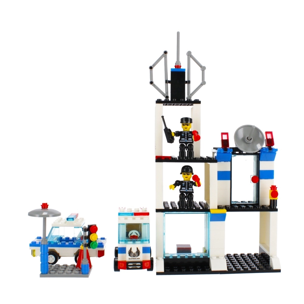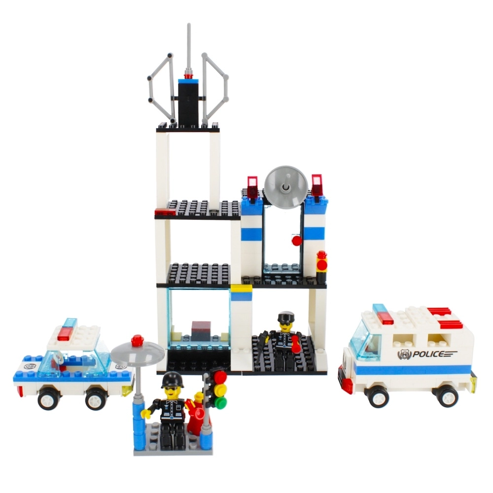 - Komplet policijske postaje, 2 vozili, minifigurice, dodatki, montažni priročnik