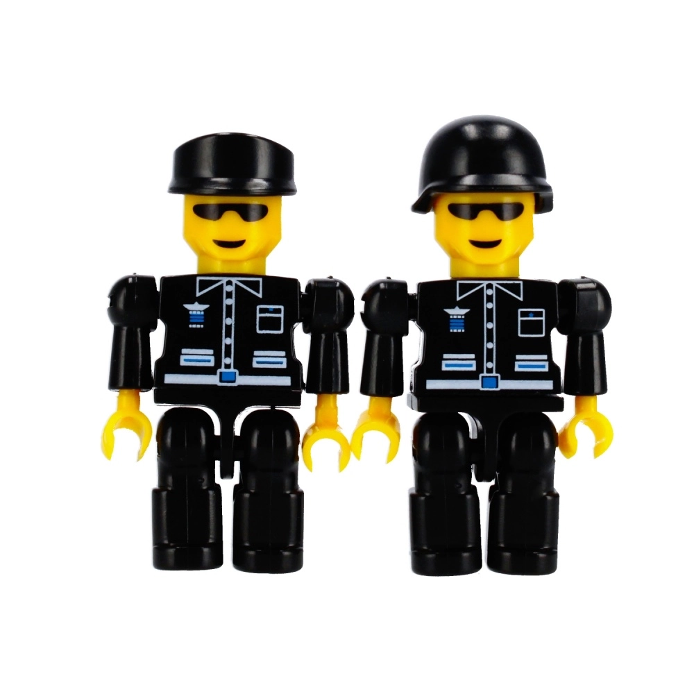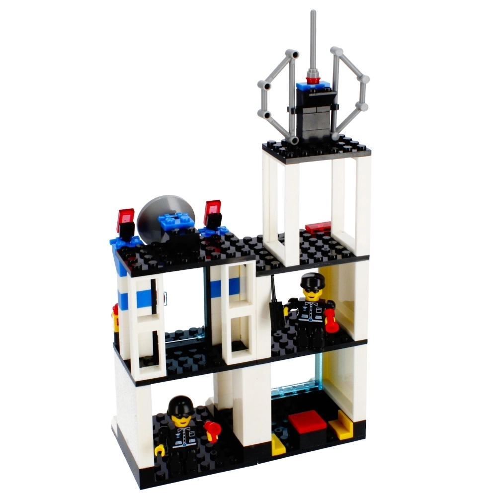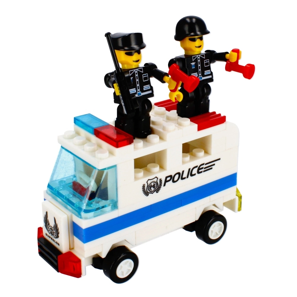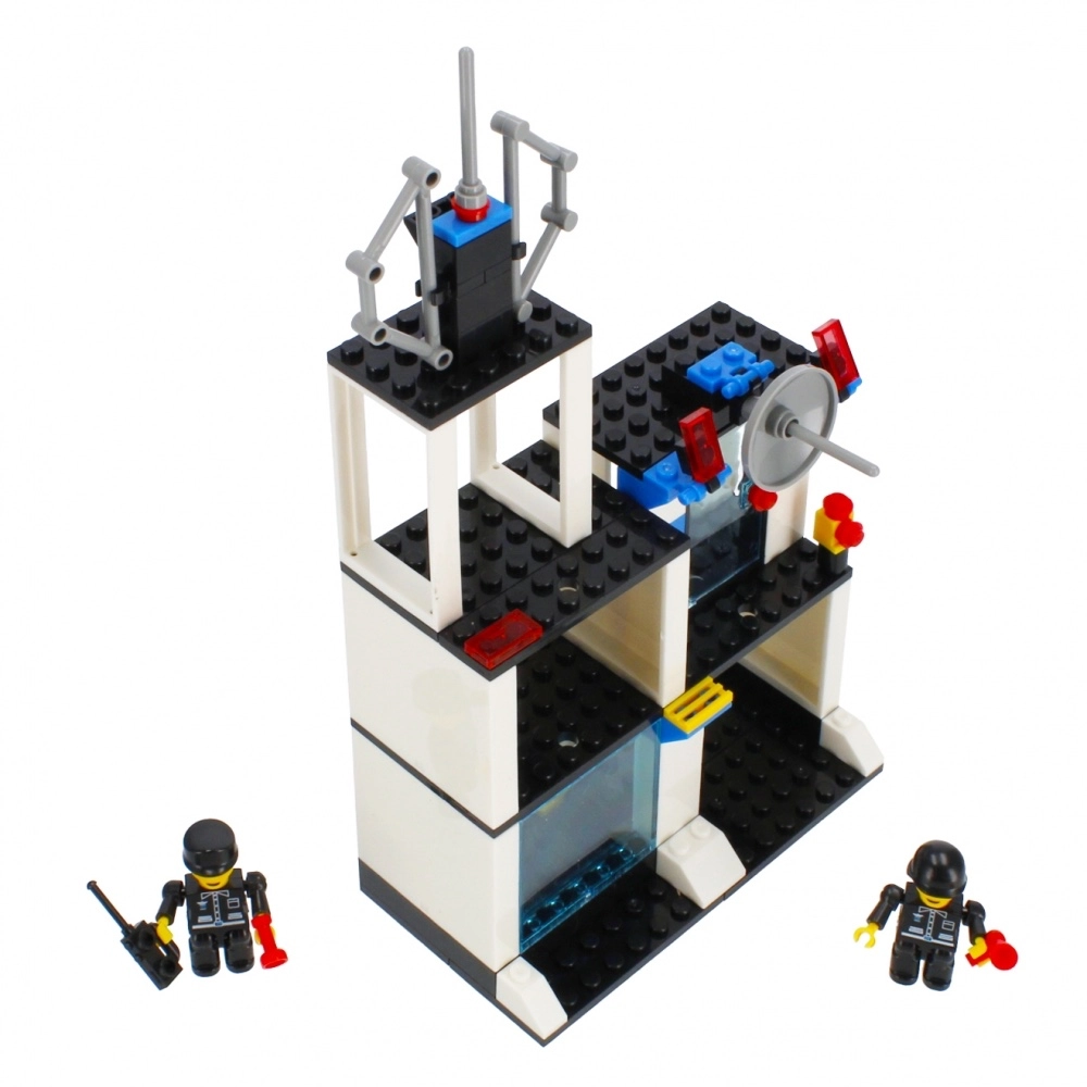 - Komplet policijske postaje, 2 vozili, minifigurice, dodatki, montažni priročnik