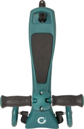 Stabilnost in varnost zagotavljata dve veliki sprednji kolesi in manjše zadnje kolo z nožno zavoro. Tih in gladek tek podpirajo ležaji ABEC-5, gumijasti TPE ročaji pa čvrst oprijem brez drsenja. Nizka masa 2,75 kg olajša prenašanje in vsakodnevno uporabo.