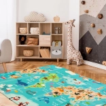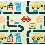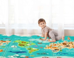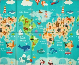 Dizajn spodbuja učenje skozi igro: zemljevid sveta z oceani, celinami in živalmi prebuja otroško radovednost o geografiji, medtem ko uličice z avtomobilčki in stavbami krepijo domišljijo in ustvarjalno igro. Podloga je vodoodporna in higienska – dovolj je, da jo obrišete z vlažno krpo, ne zadržuje prahu in je primerna tudi za alergike.