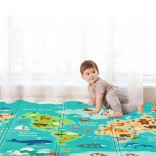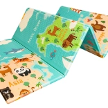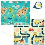 Ena stran z barvnim zemljevidom sveta in živalmi, druga z mestom in cestami za avtomobilčke. Dve izobraževalni temi v eni podlogi razvijata domišljijo in znanje.