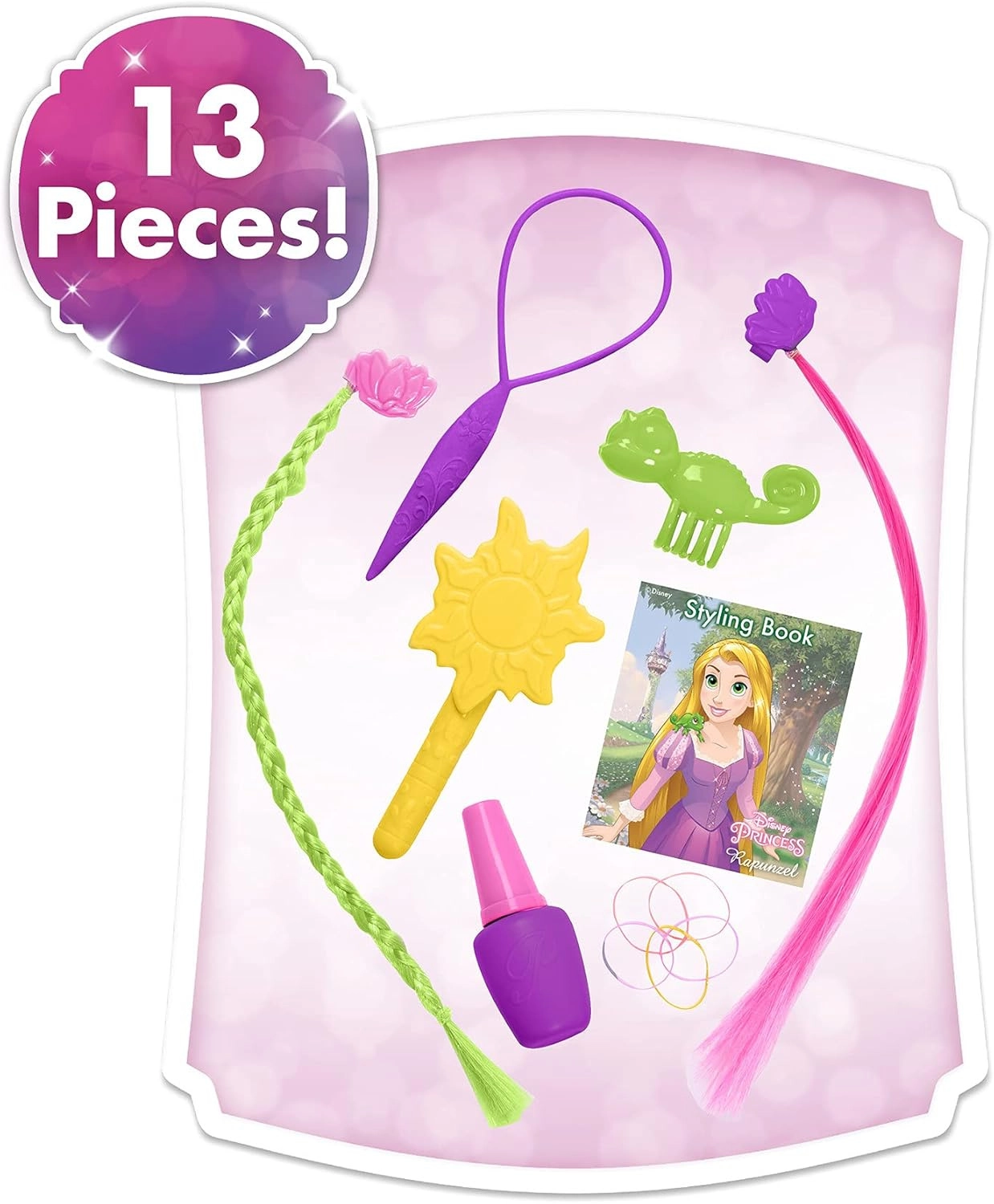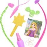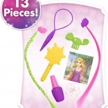 V kompletu je 13-delni set praktičnih pripomočkov: krtača, orodje za ustvarjanje pričesk, barvite elastike, klipsi s prameni, tematske sponke ter majhna knjiga idej za hitro inspiracijo. Dodatke lahko uporabljate tako na glavi Rapunzel kot tudi v otrokovih laseh.