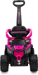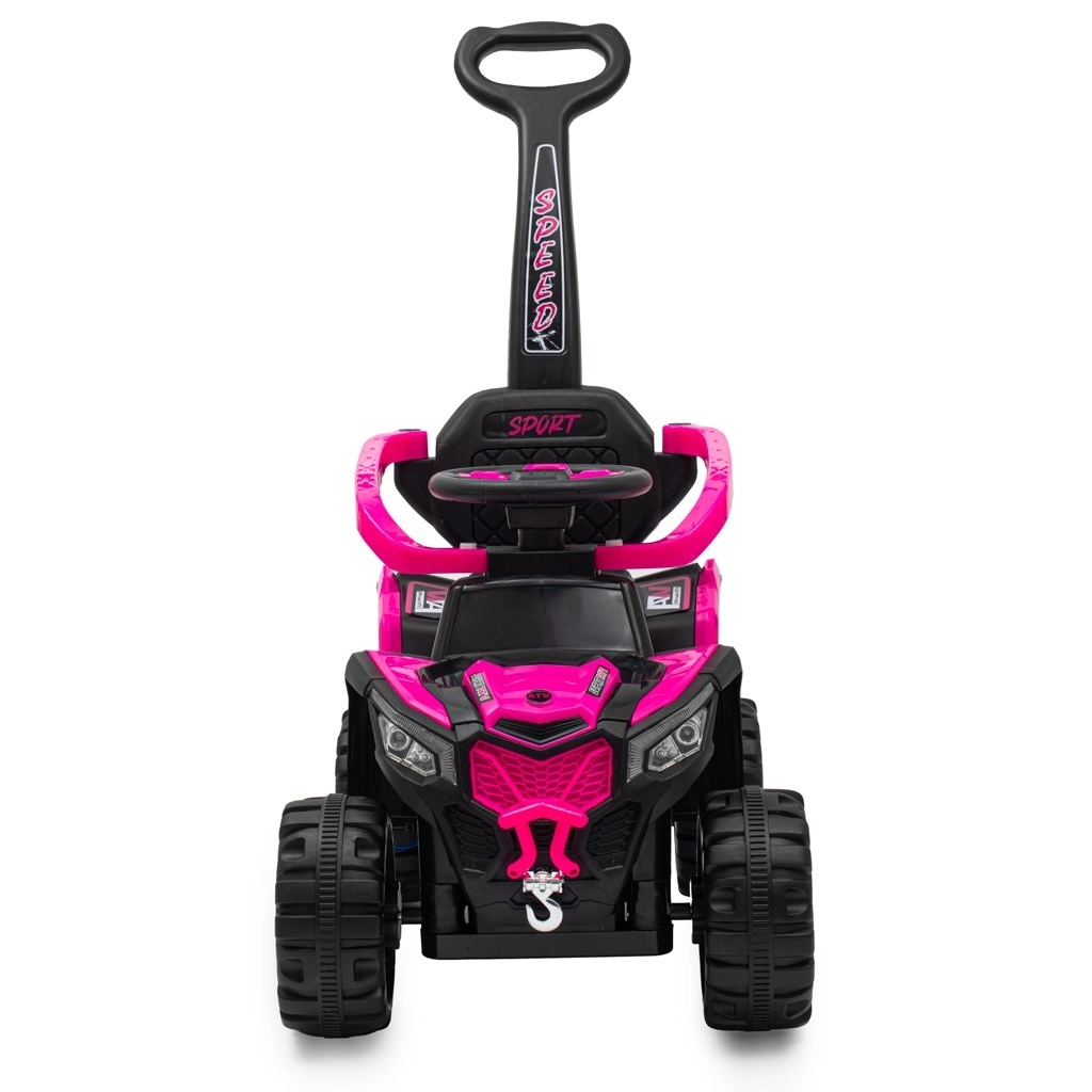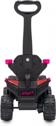 Ruggy izstopa s terenskim videzom in masivnimi kolesi, ki poganjalcu zagotavljajo stabilnost in zanesljivost na različnih površinah. Otrok vozi z volanom in se lahko poganja, medtem ko imajo starši nad vožnjo popoln nadzor zahvaljujoč visoki vodilni palici. Za udobje skrbita ergonomsko oblikovan sedež iz ekološkega usnja in praktični naslonjali.
