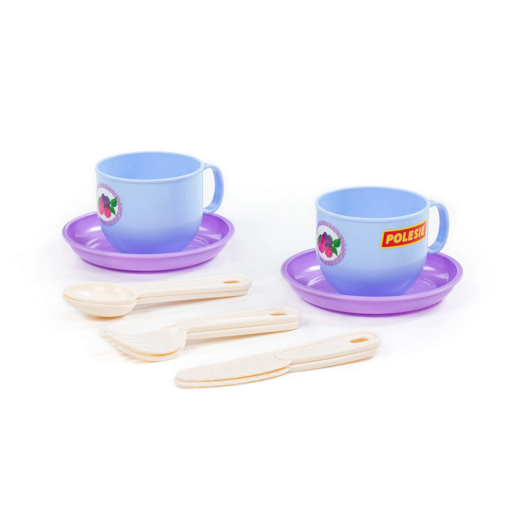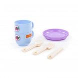 Dve skodelici s podstavki in osnovni jedilni pribor tvorijo praktičen set za prve pogrinjke in čajne zabave.