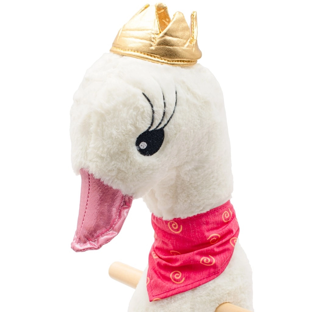 Ta elegantni beli labod z rožnatimi detajli in zlato kronico bo navdušil male princeske in njihove starše. Igrača je izdelana iz mehkega in prijetnega materiala, medtem ko leseno podnožje s kolesci omogoča enostavno izmenjavo med guganjem in vožnjo. Vgrajena melodija podpira senzorični razvoj in igri doda nov razsežnost.