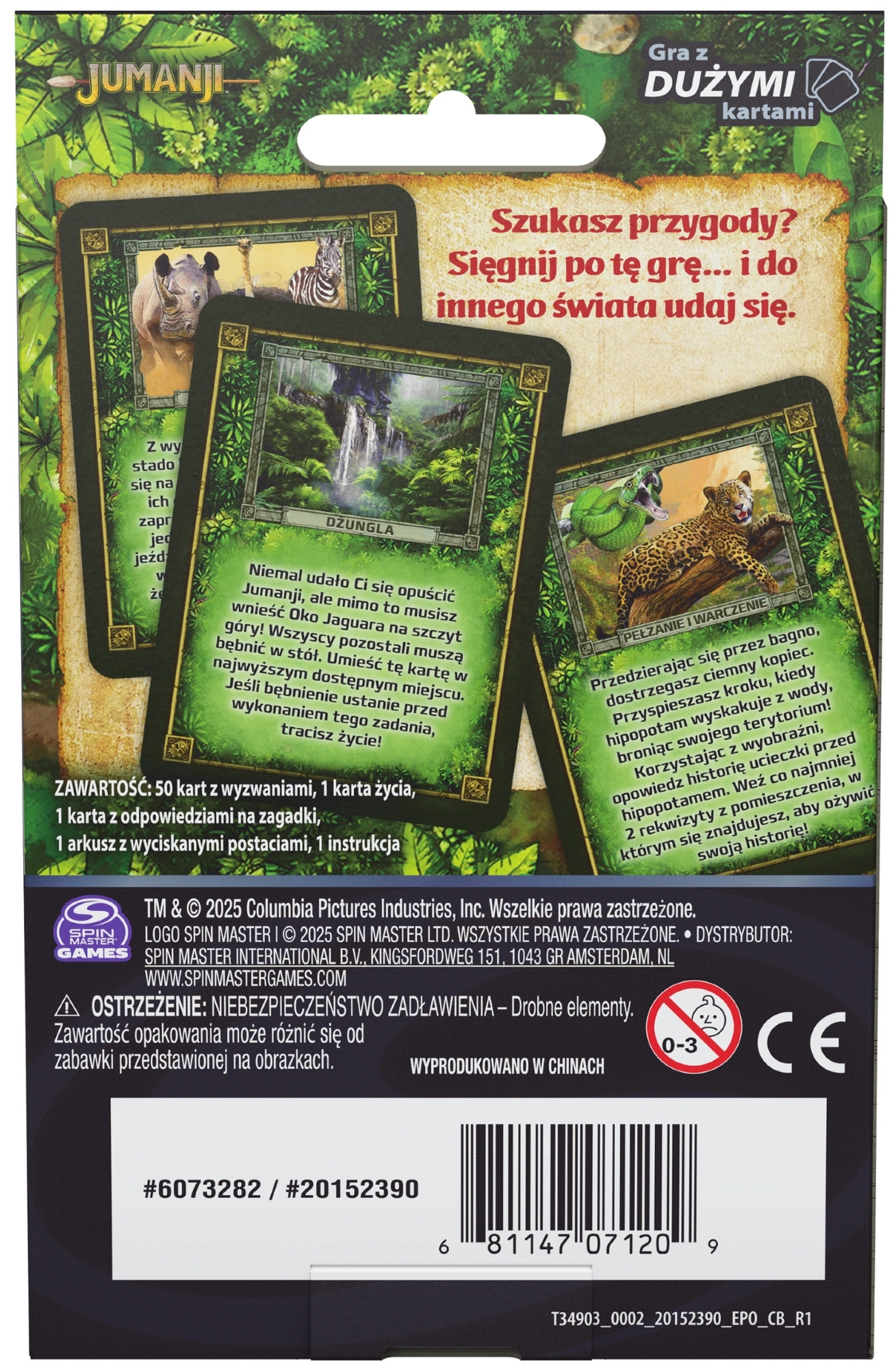 Vstopite v džungelski svet JUMANJI z družabno kartno igro znamke Spin Master. V paketu vas čaka več kot 50 kart polnih ugank in izzivov, ki preizkusijo vašo pogum in sodelovanje. Izpolnjujte naloge, preživite pasti in uživajte v zabavi doma, na poti ali s prijatelji. Poljska jezikovna različica, primerno za otroke od 8 let.